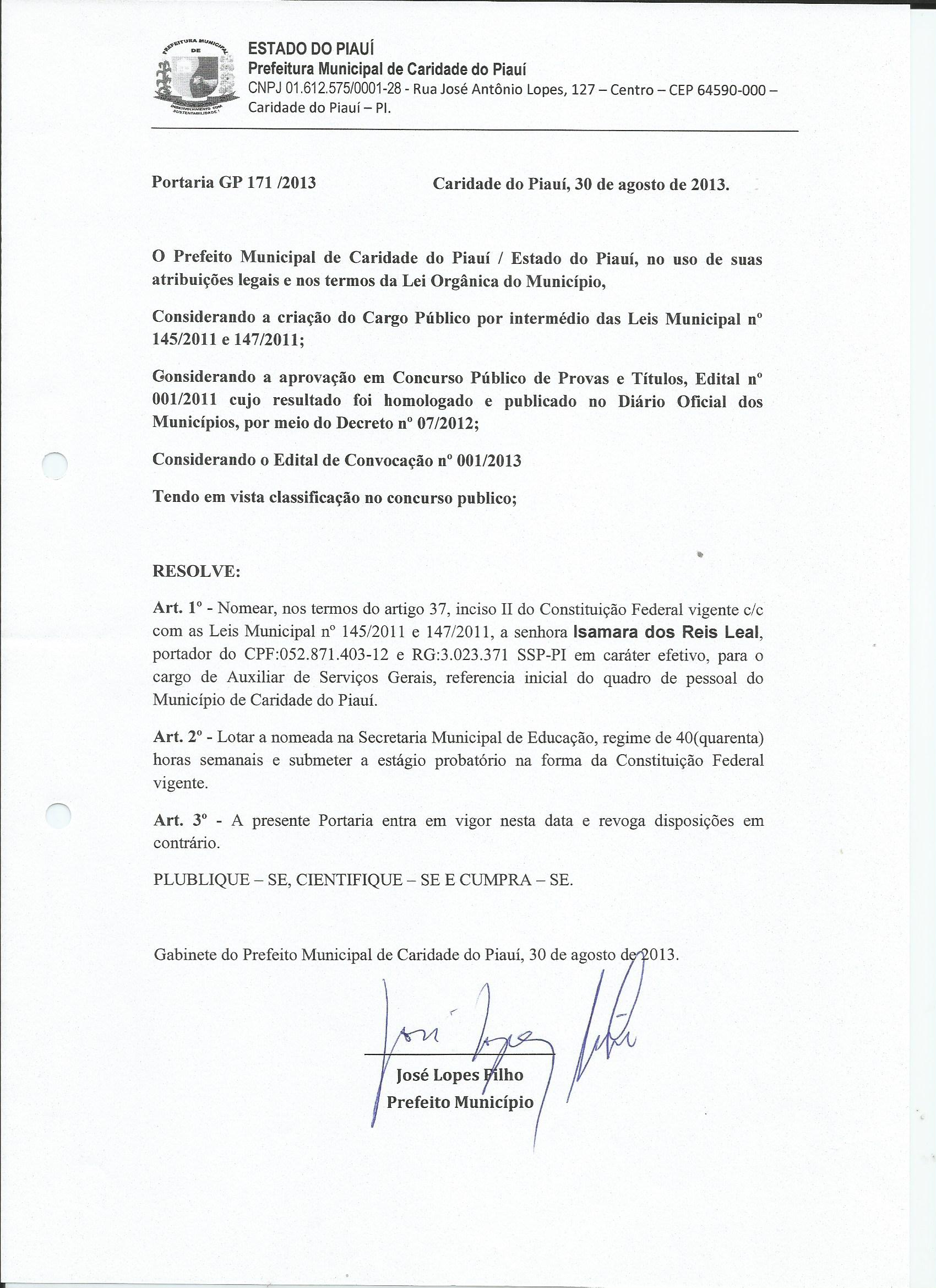 Lei publicada PORTARIA 171 2013PORTARIA |