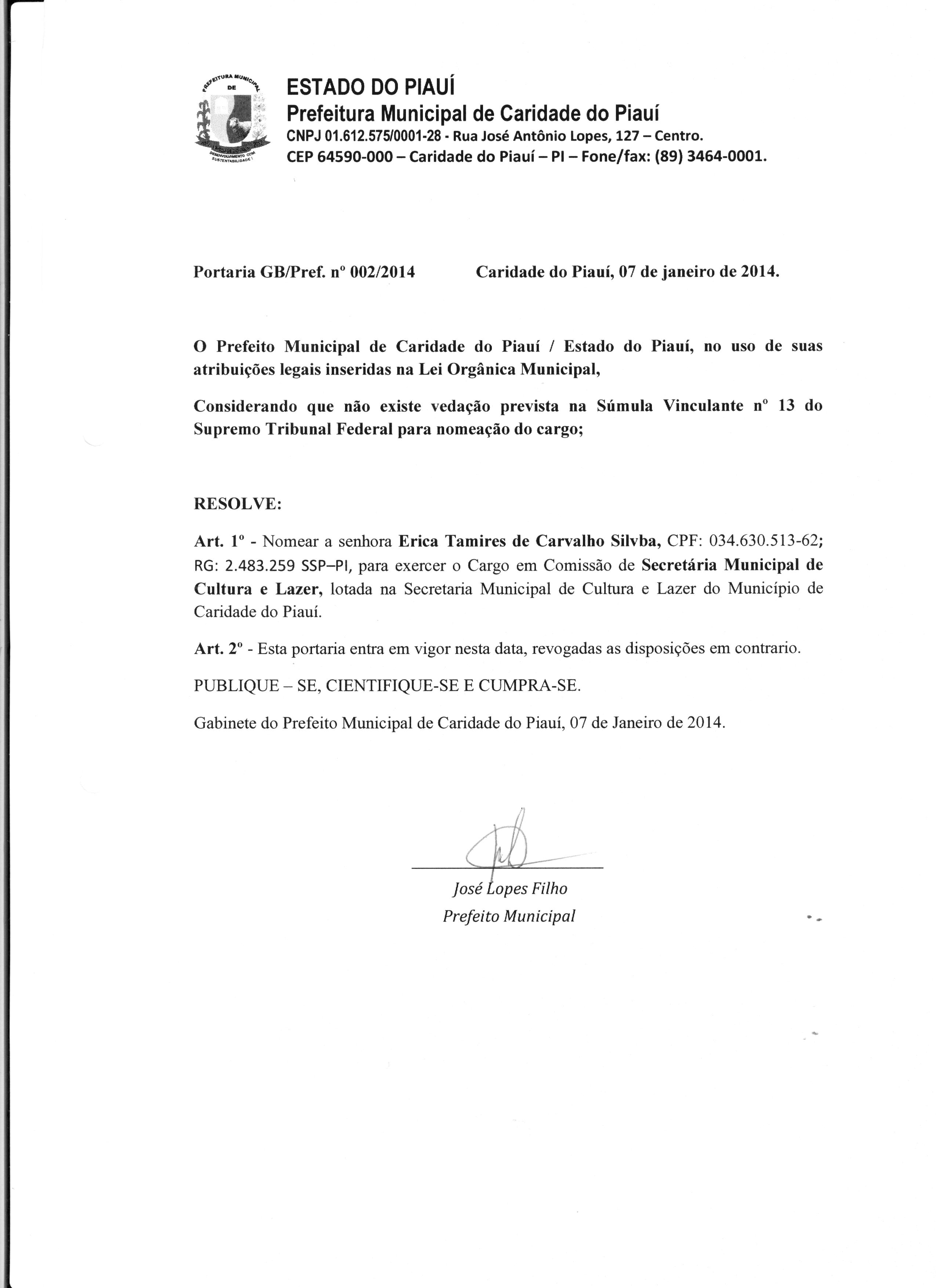 Lei publicada PORTARIA Nº 002/2014PORTARIA |