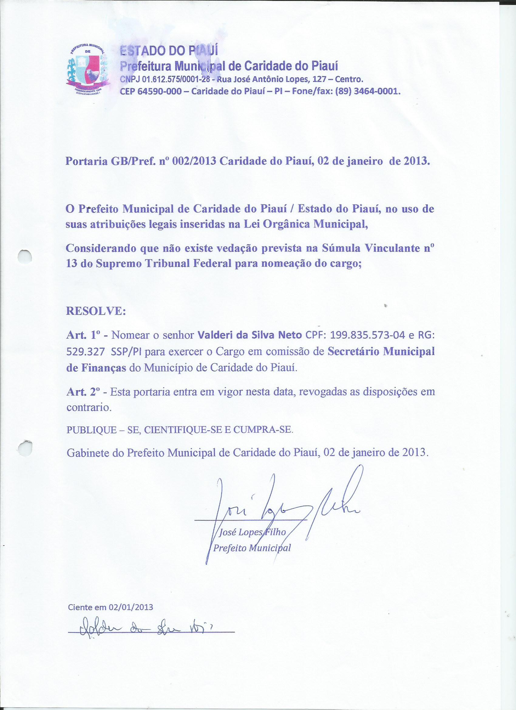 Lei publicada PORTARIA Nº 002/2013PORTARIA |