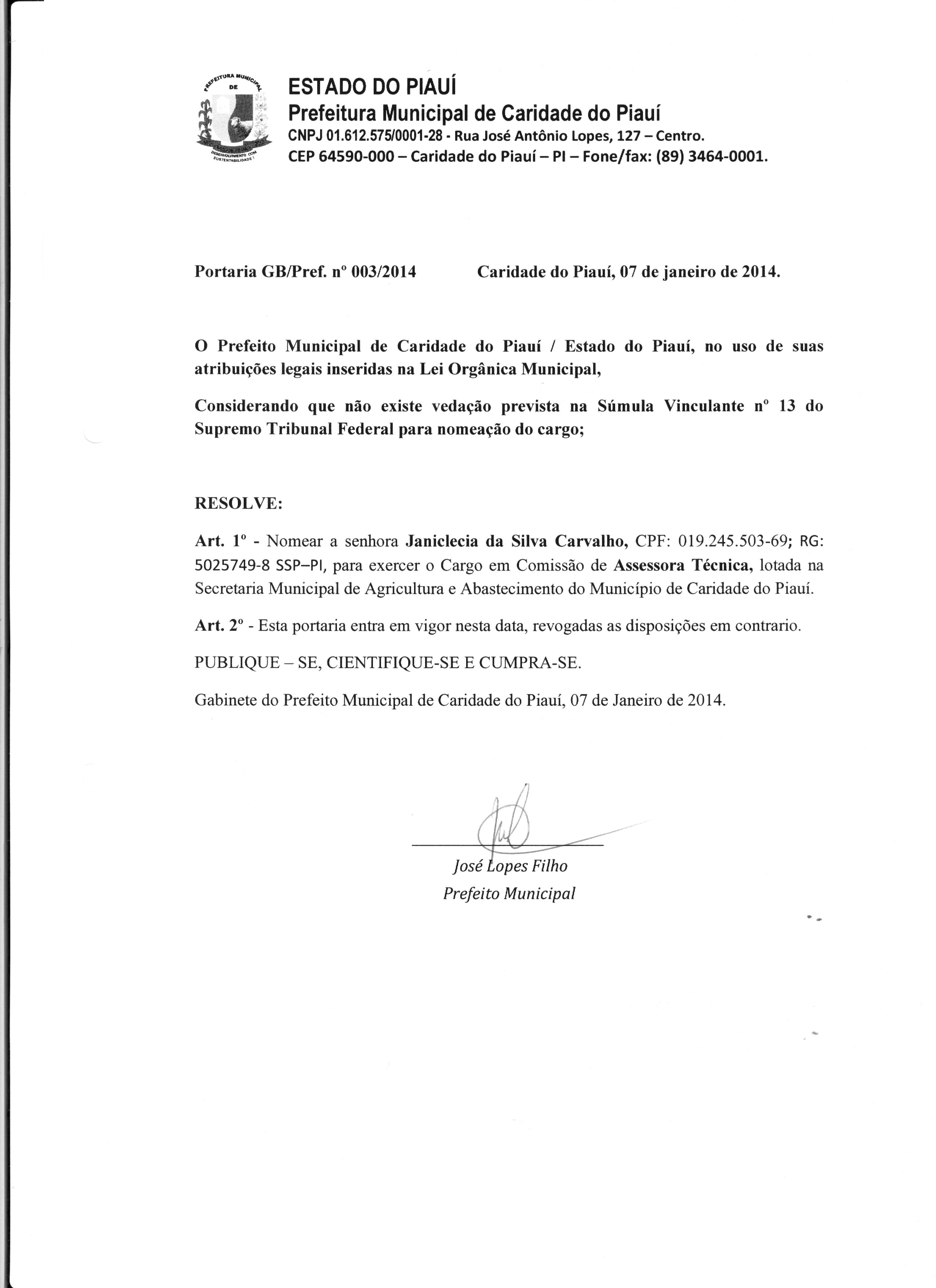 Lei publicada PORTARIA Nº 003/2014PORTARIA |