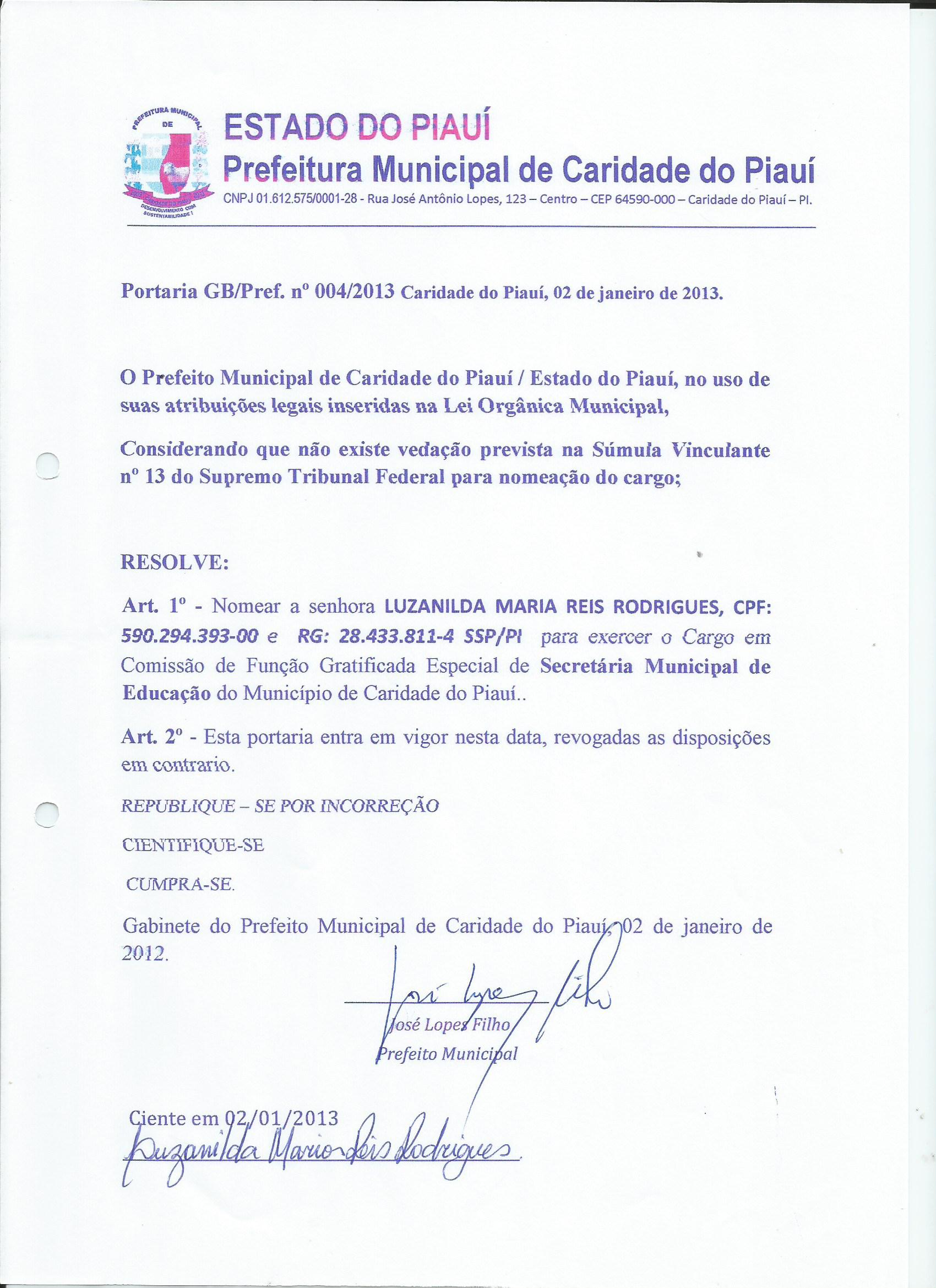 Lei publicada PORTARIA Nº 004/2013PORTARIA |