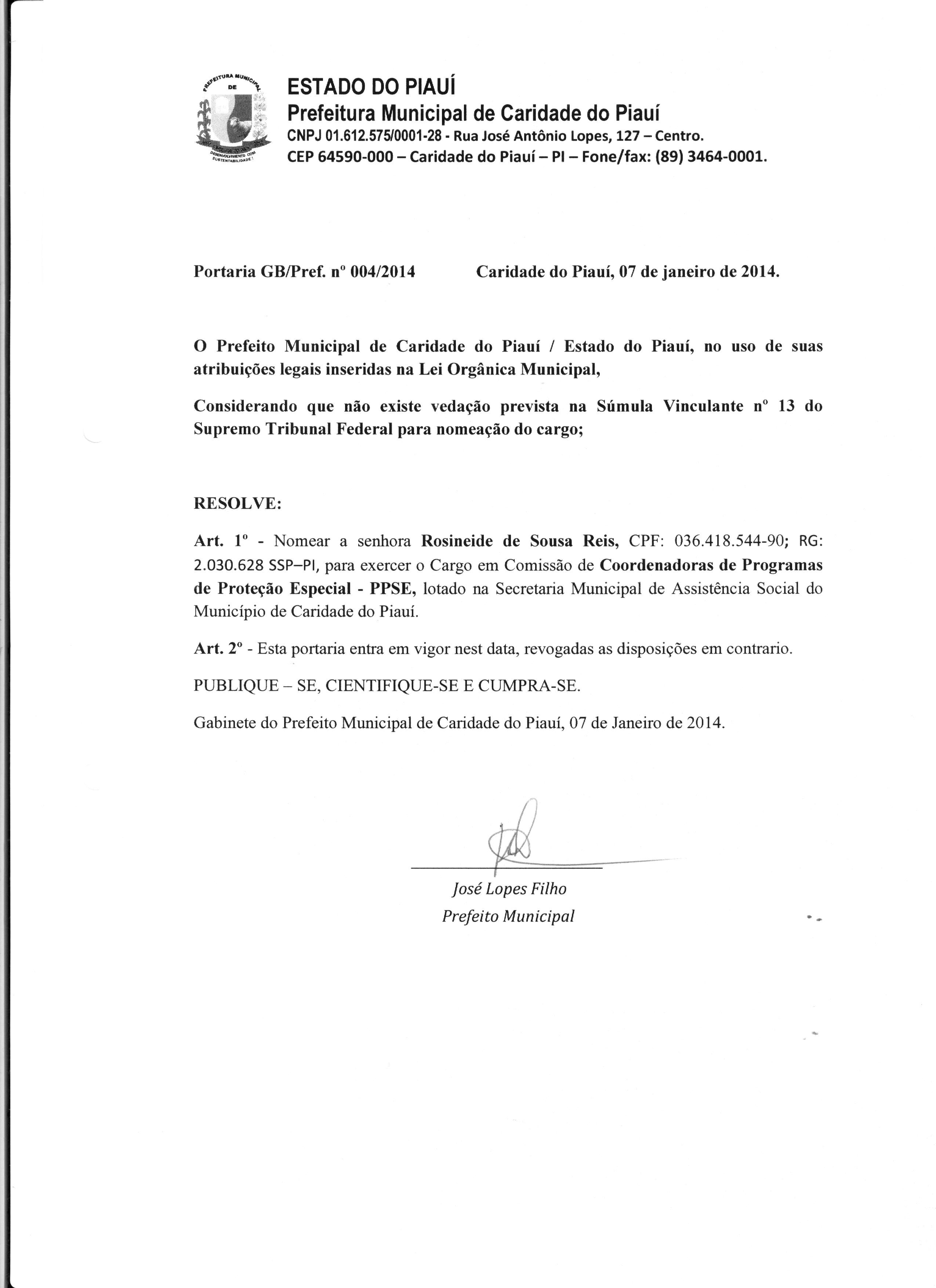 Lei publicada PORTARIA Nº 004/2014PORTARIA |