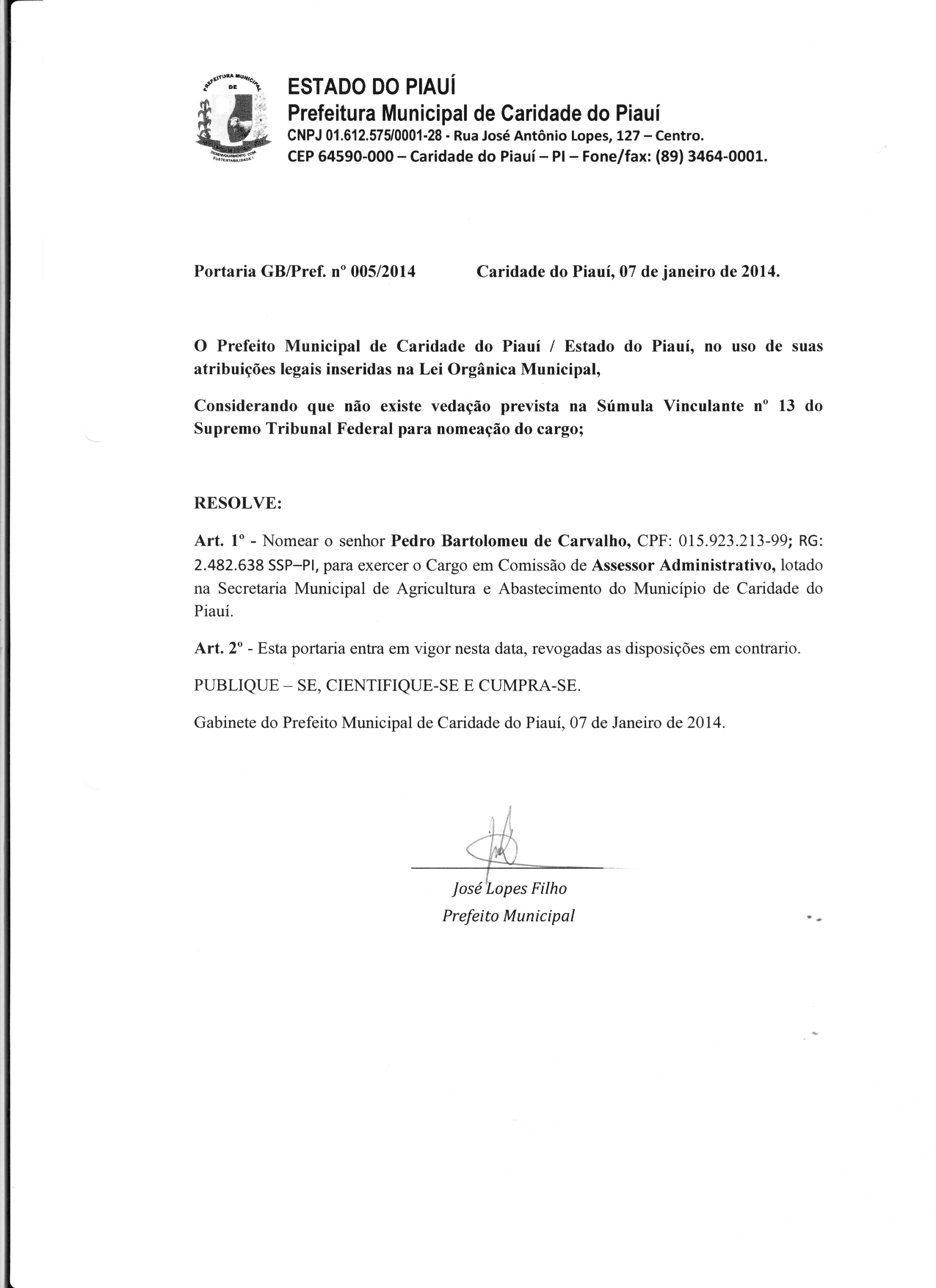Lei publicada PORTARIA Nº 005/2014PORTARIA |