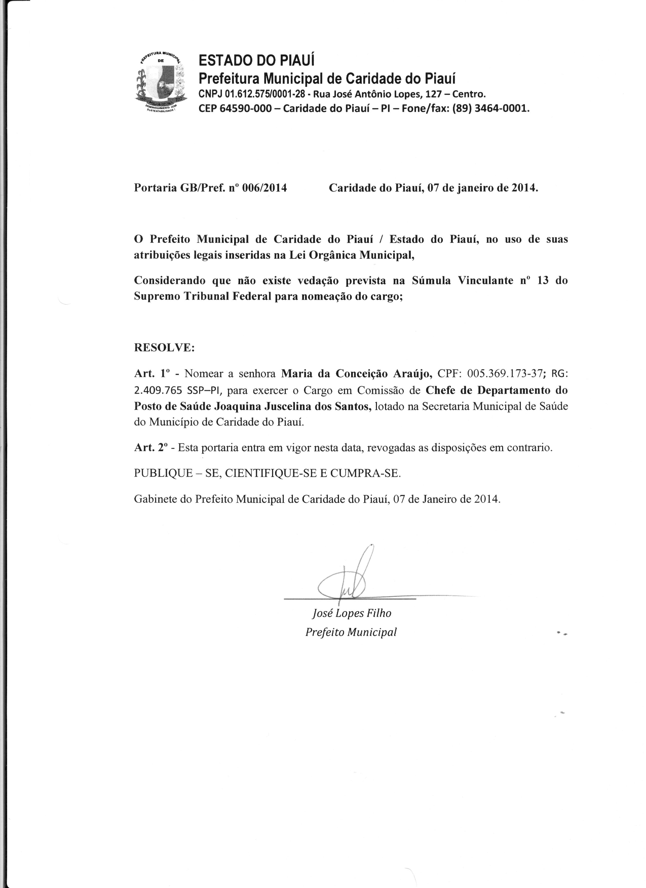 Lei publicada PORTARIA Nº 006/2014PORTARIA |