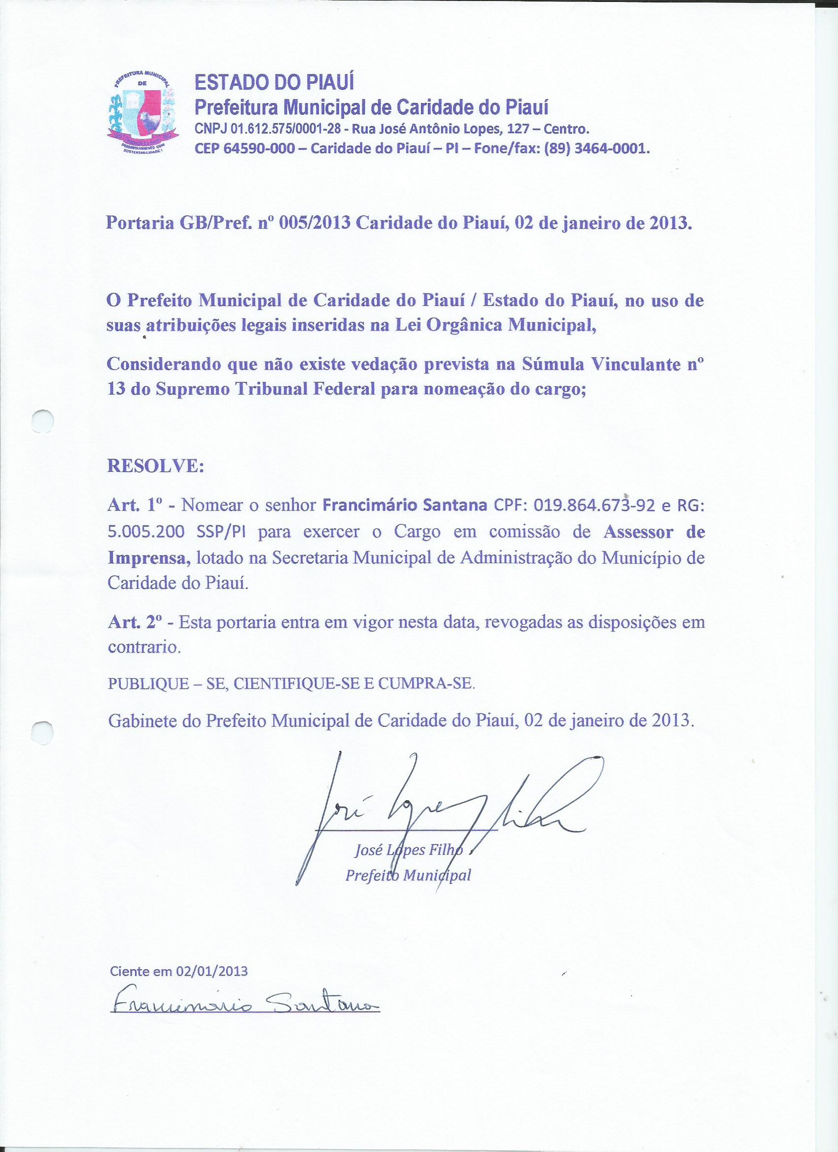 Lei publicada PORTARIA Nº 005/2013PORTARIA |