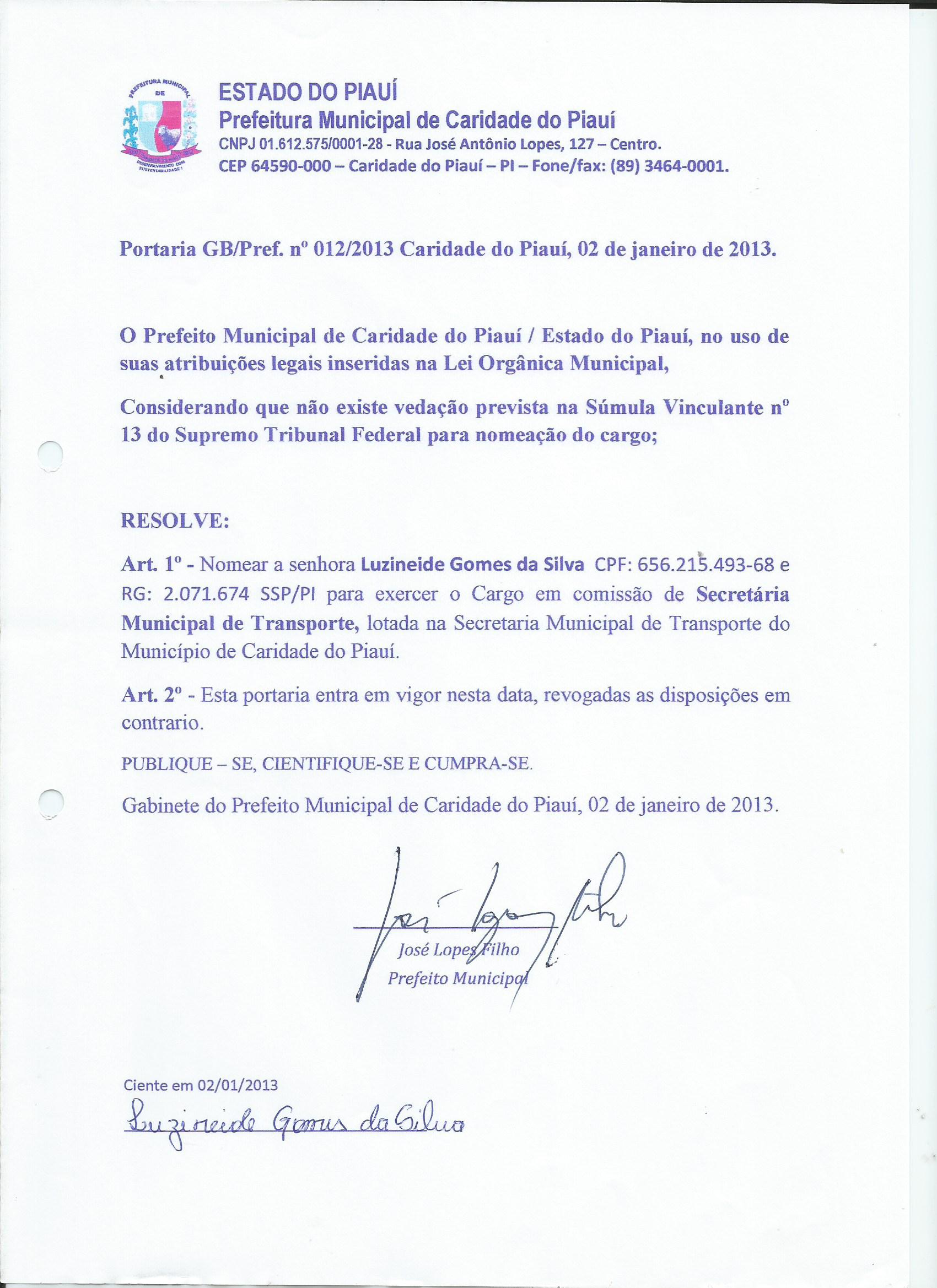 Lei publicada PORTARIA Nº 012/2013PORTARIA |