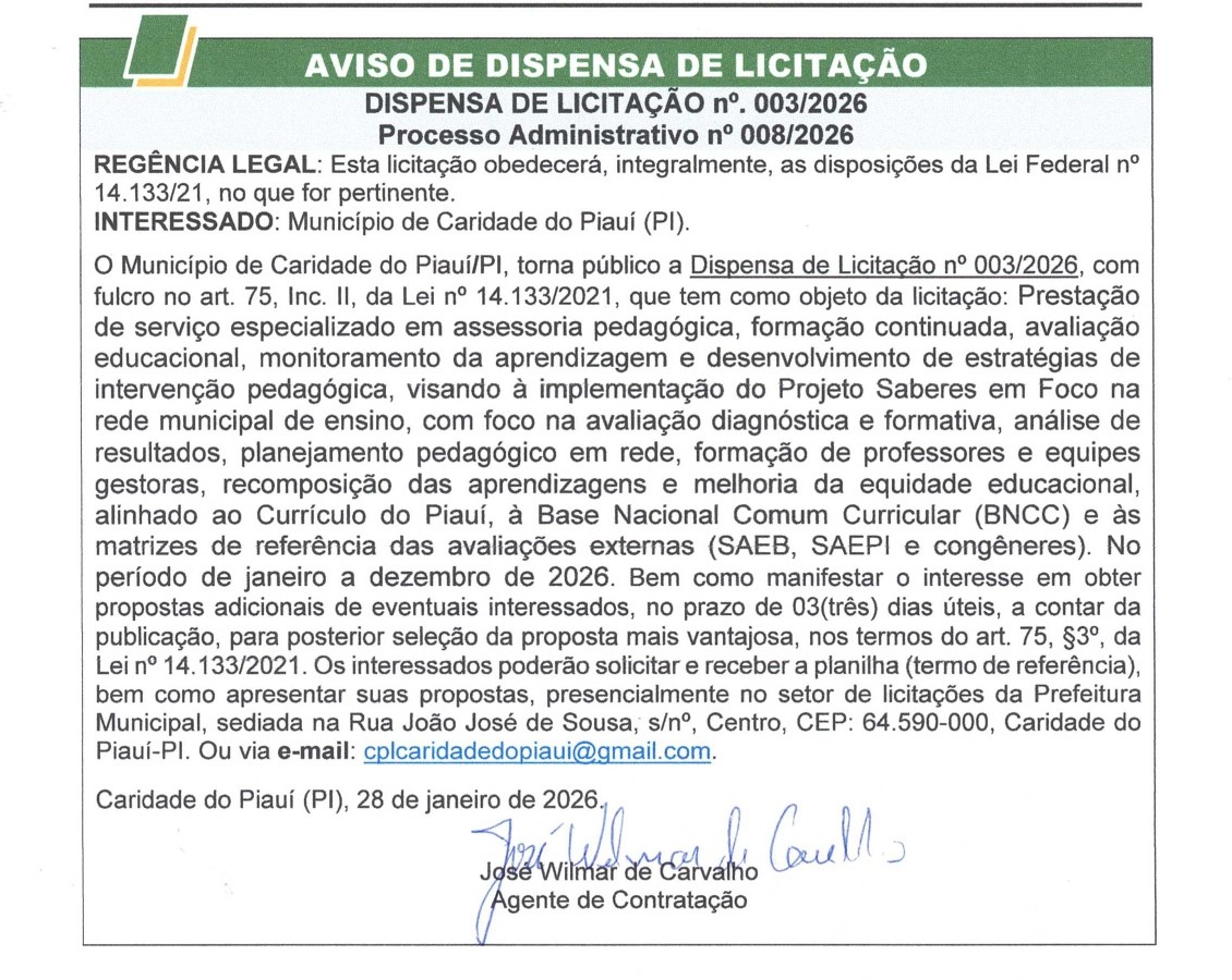 AVISO DE DISPENSA DE LICITAÇÃO N° 003/2026