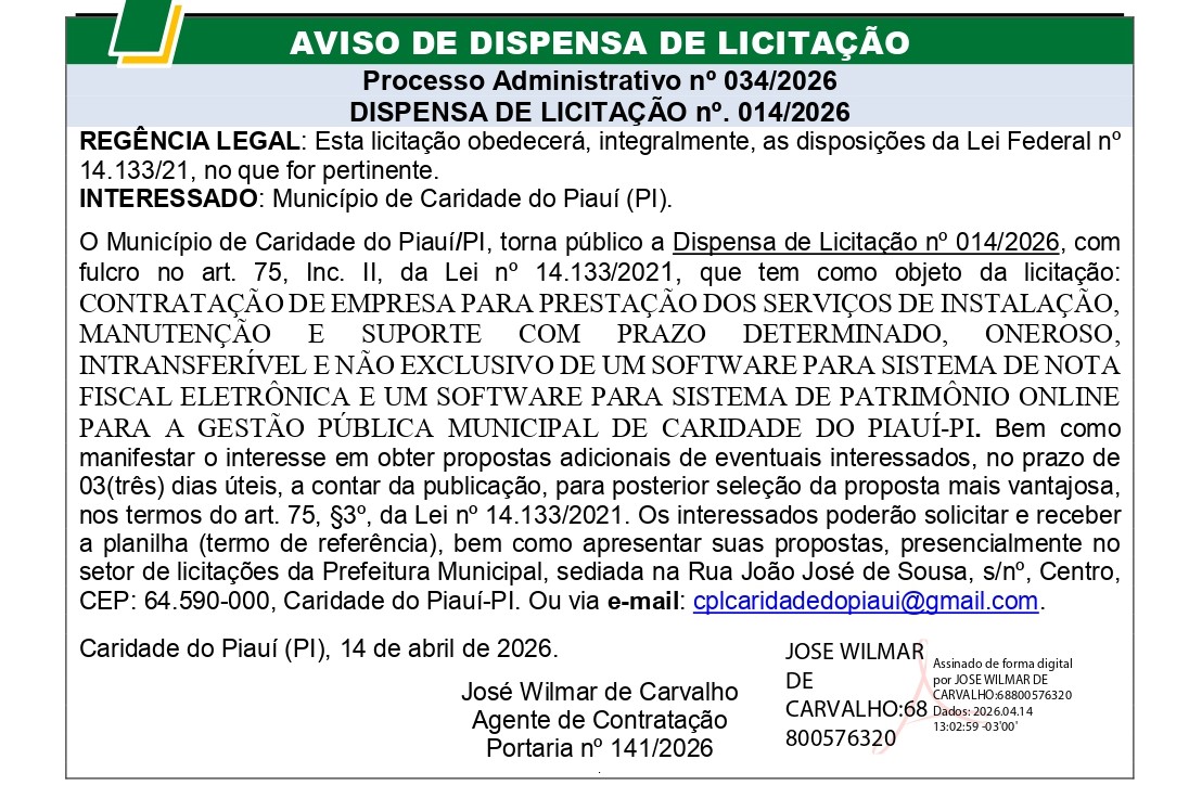 AVISO DE DISPENSA DE LICITAÇÃO Nº 014/2026