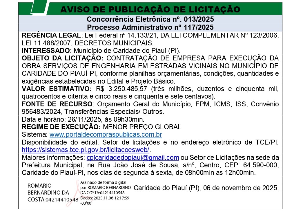AVISO DE LICITAÇÃO CONCORRÊNCIA ELETRÔNICA N° 013/2025