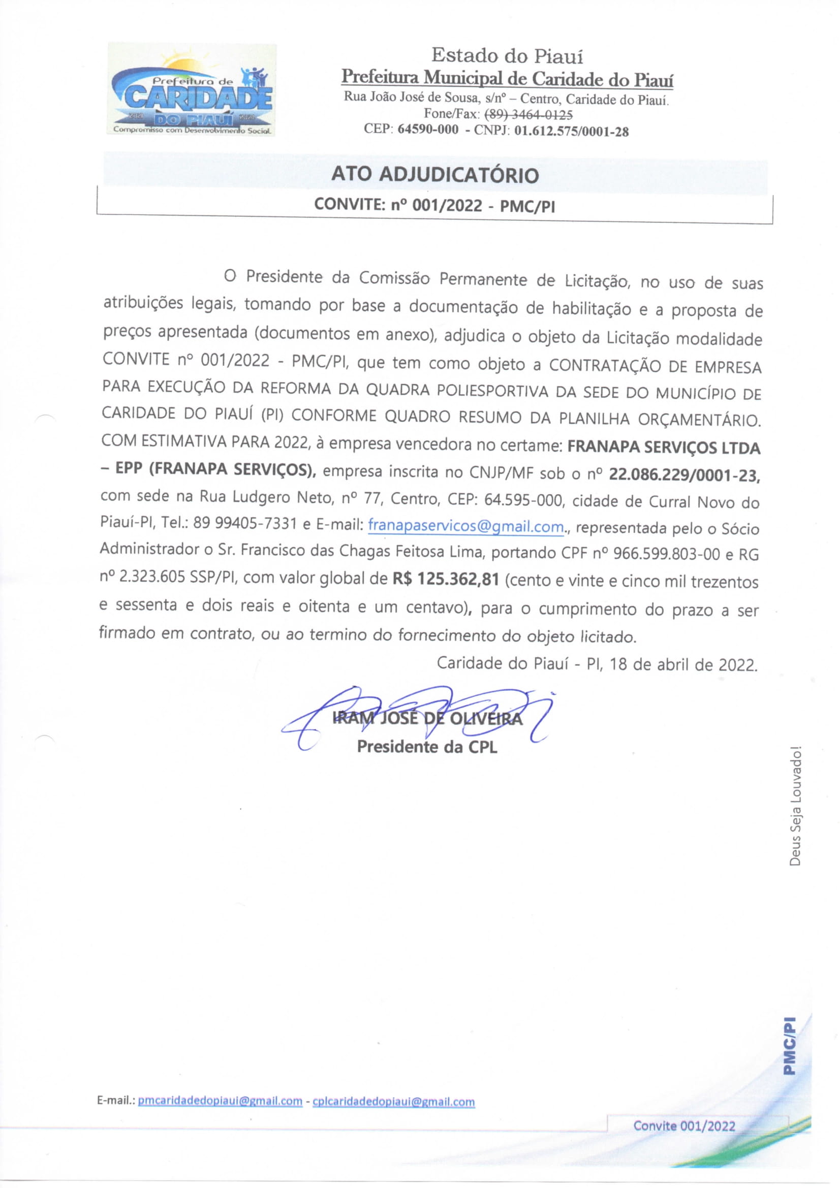 ATO ADJUDICATÓRIO CONVITE: n° 001/2022