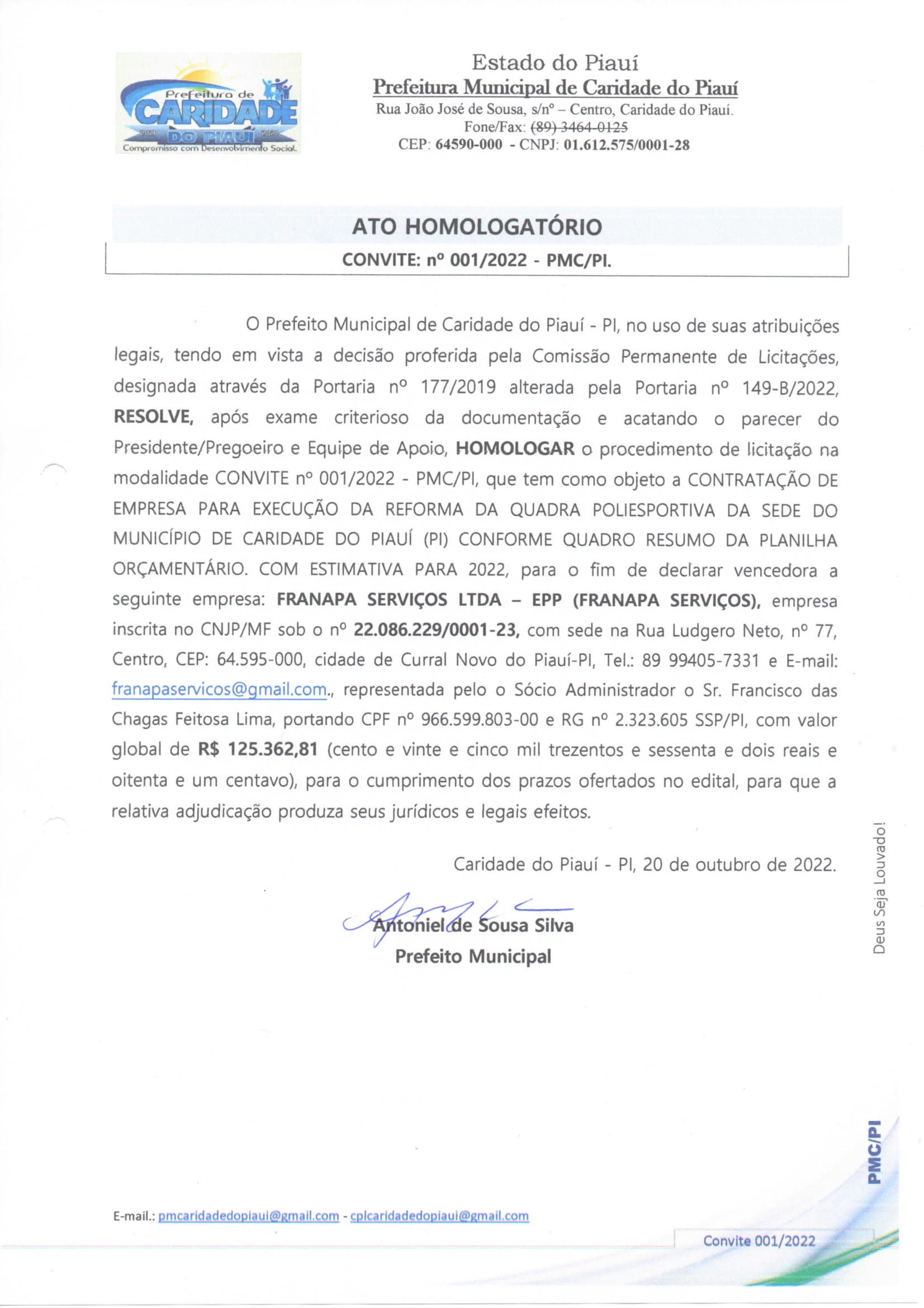 ATO HOMOLOGATÓRIO CONVITE n° 001/2022