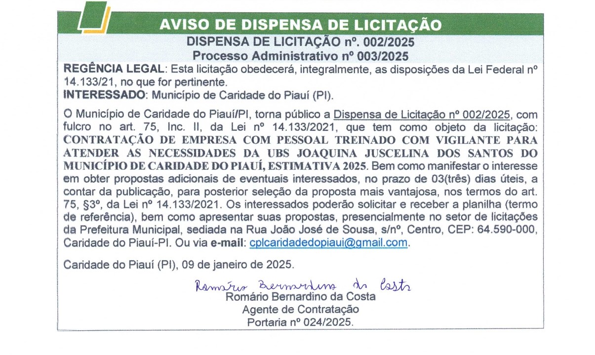 AVISO DE DISPENSA DE LICITAÇÃO N° 002/2025