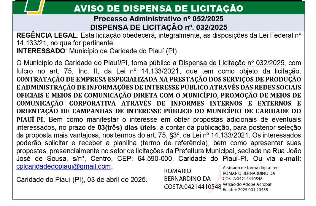 AVISO DE DISPENSA DE LICITAÇÃO N° 032/2025