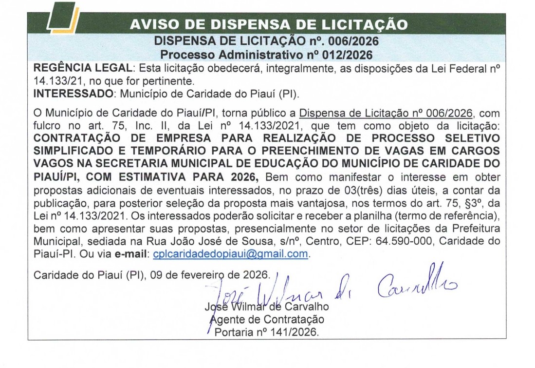 AVISO DE DISPENSA DE LICITAÇÃO Nº 006/2026