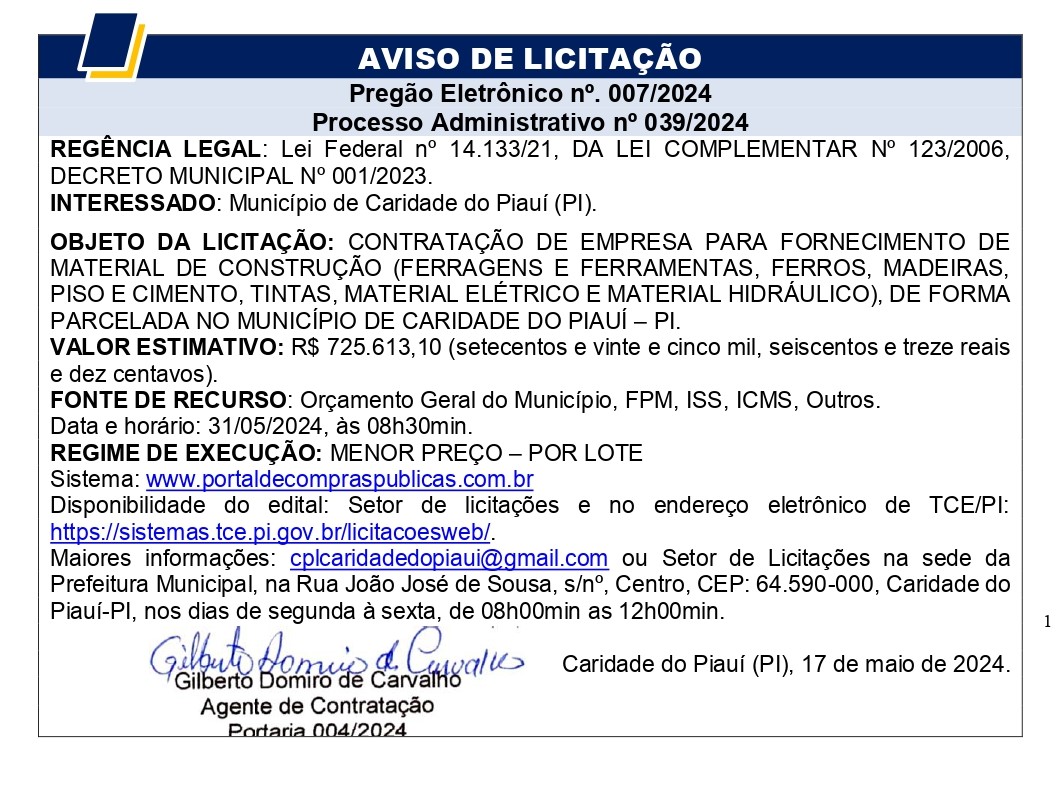 AVISO DE LICITAÇÃO DE PREGÃO ELETRÔNICO n°. 007/2024