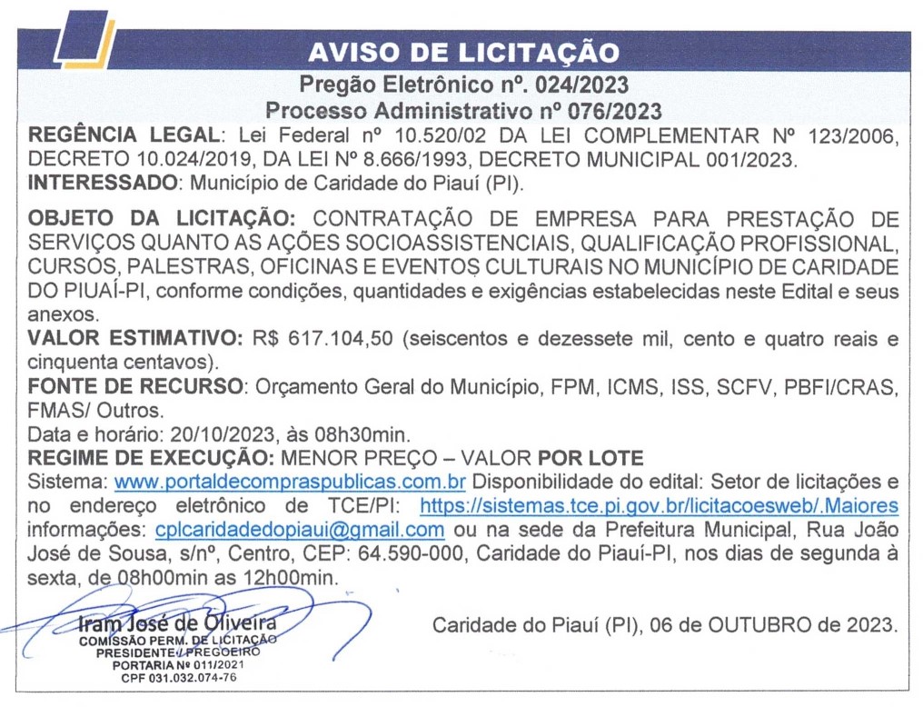 AVISO DE LICITAÇÃO DE PREGÃO ELETRÔNICO n°. 024/2023