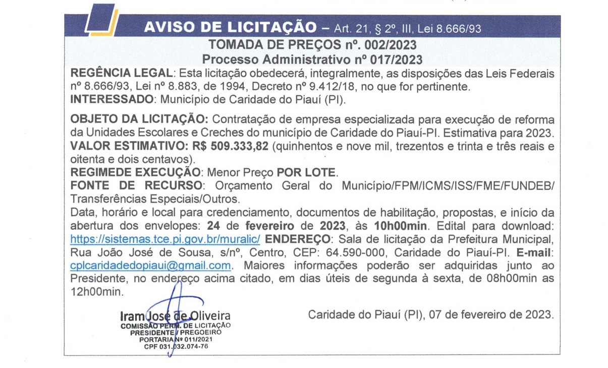 AVISO DE LICITAÇÃO TOMADA DE PREÇOS N° 002/2023