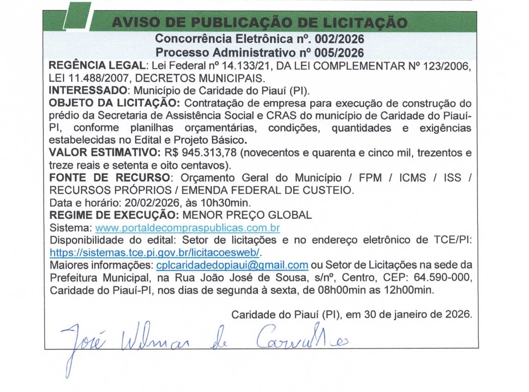 AVISO DE PUBLICAÇÃO DE LICITAÇÃO DE CONCORRÊNCIA ELETRÔNICA N° 002/2026