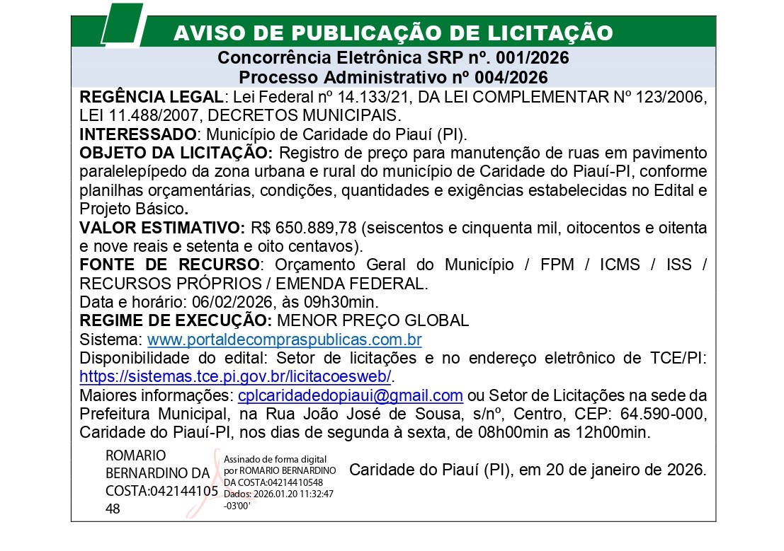 AVISO DE PUBLICAÇÃO DE LICITAÇÃO DE CONCORRÊNCIA ELETRÔNICA SRP N° 001/2026