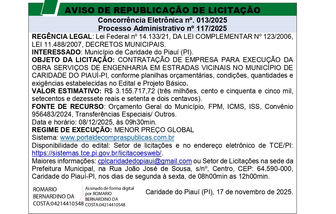AVISO DE REPUBLICAÇÃO DE LICITAÇÃO CONCORRÊNCIA ELETRÔNICA N° 013/2025