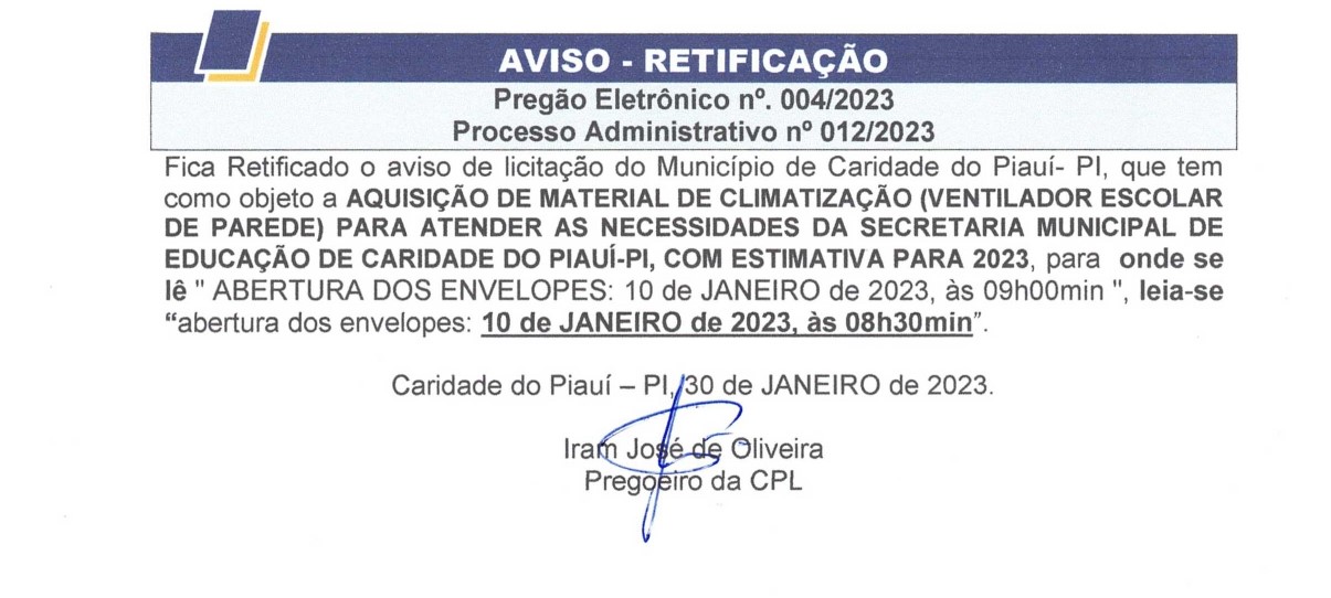 AVISO DE RETIFICAÇÃO AO PREGÃO ELETRÔNICO N° 004/ 2023
