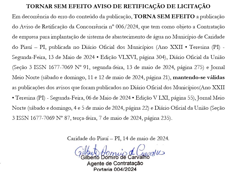 AVISO DE RETIFICAÇÃO DE LICITAÇÃO DA CONCORRÊNCIA N° 006/2024