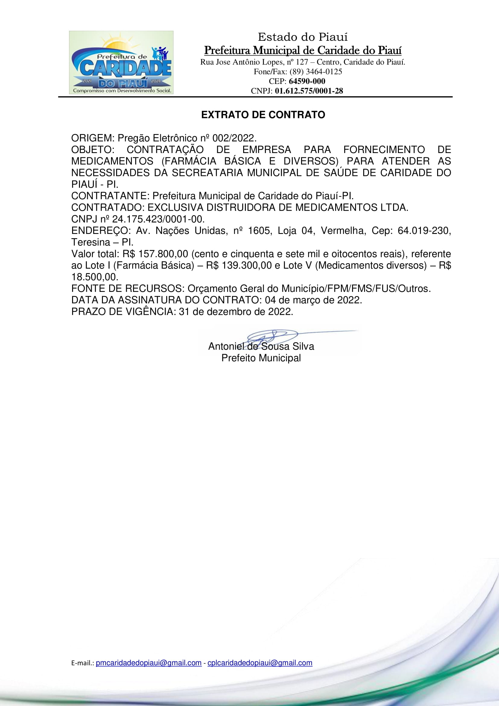 CONTRATAÇÃO DE EMPRESA PARA FORNECIMENTO DE MEDICAMENTOS (FARMÁCIA BÁSICA E DIVERSOS) PARA ATENDER AS NECESSIDADES DA SECREATARIA MUNICIPAL DE SAÚDE DE CARIDADE DO PIAUÍ - PI.