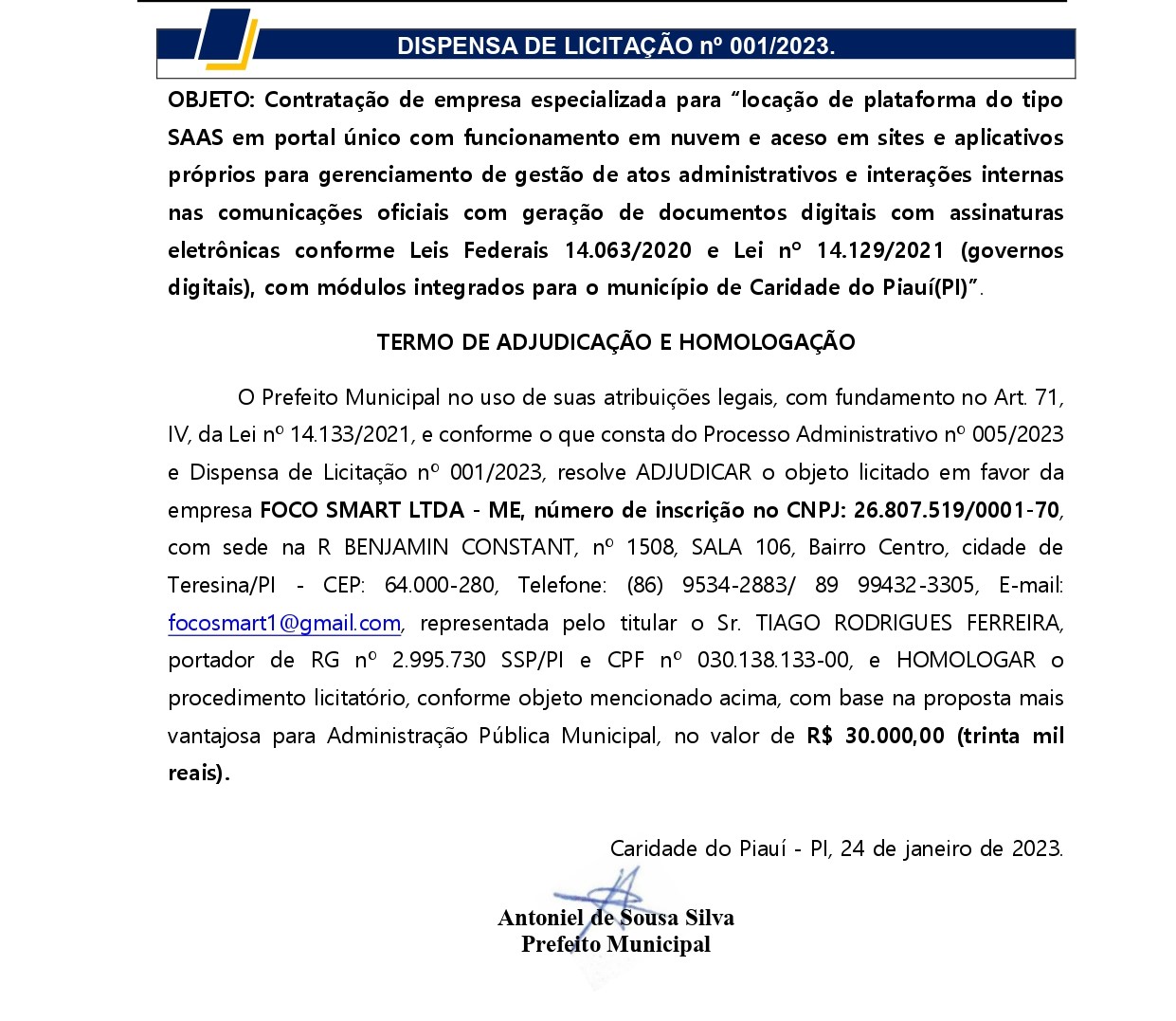 DISPENSA DE LICITAÇÃO n° 001/2023.