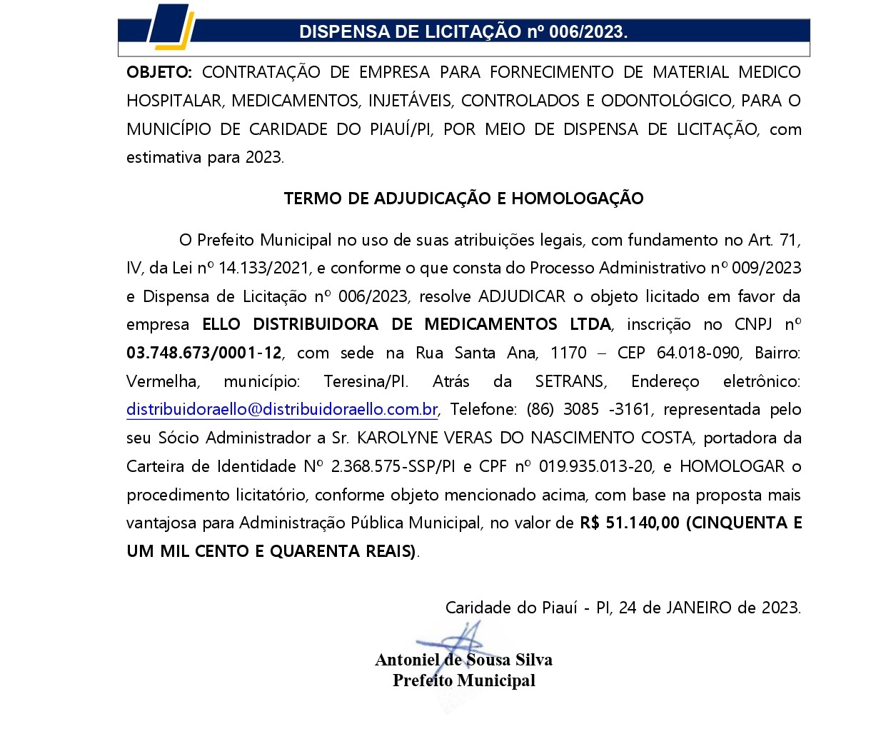 DISPENSA DE LICITAÇÃO n° 006/2023.