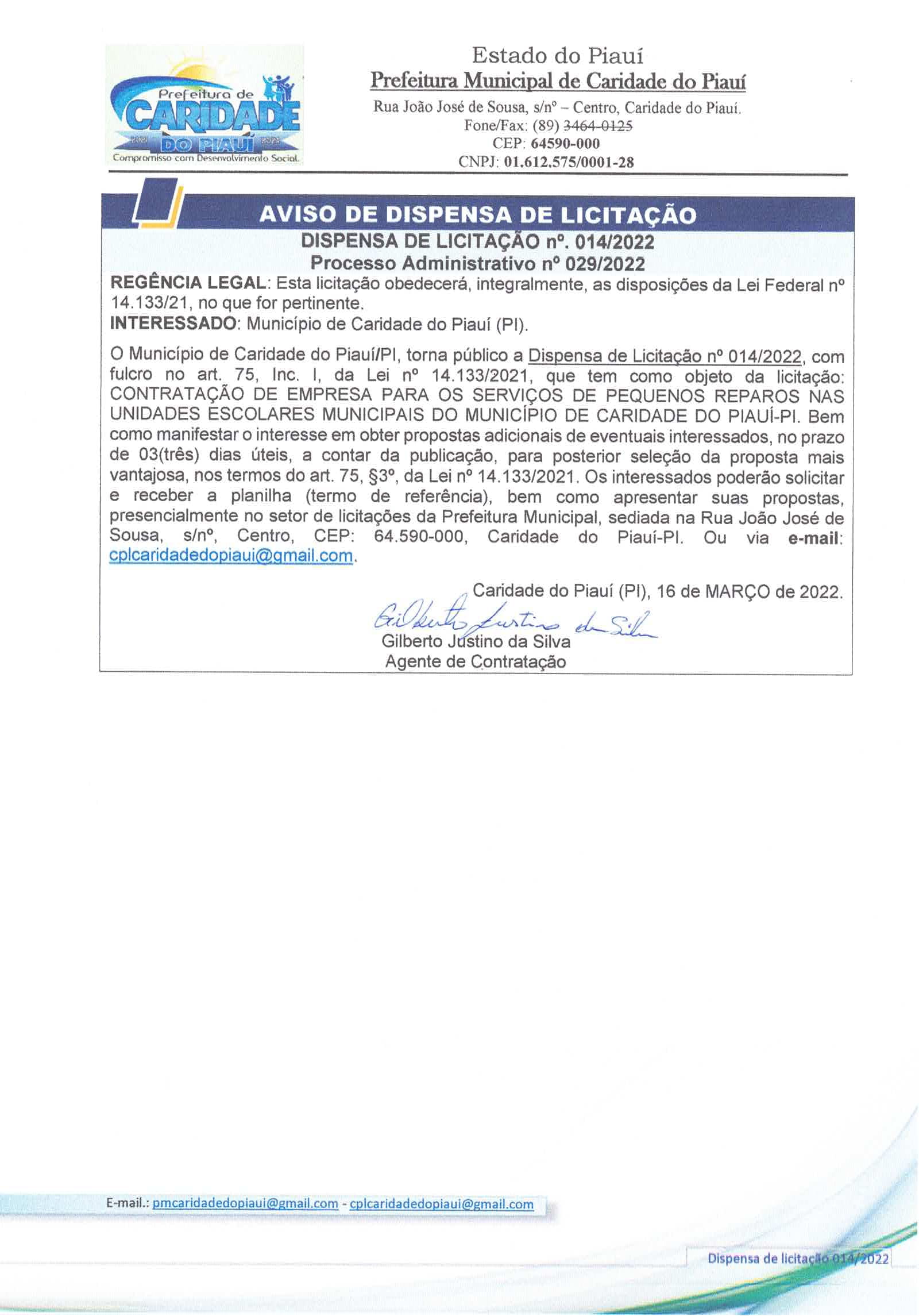 DISPENSA DE LICITAÇÃO n°. 014/2022