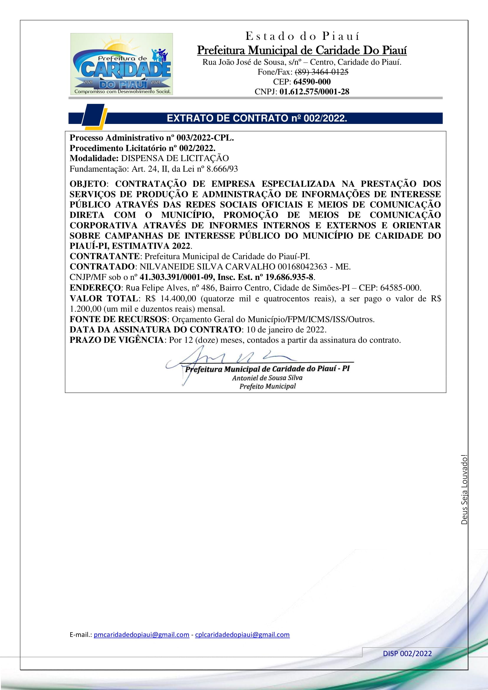 EXTRATO DE CONTRATO n° 002/2022.