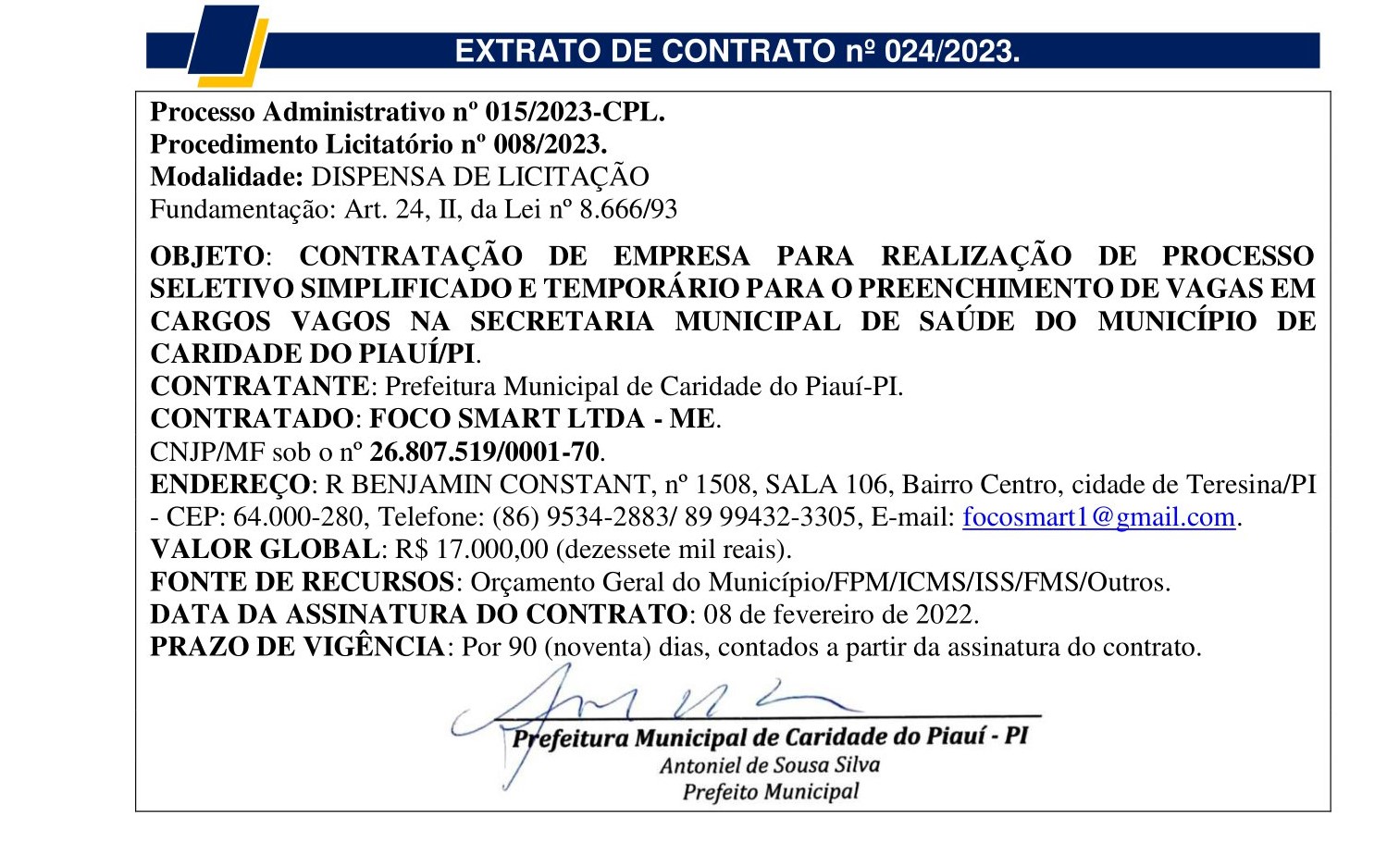EXTRATO DE CONTRATO n° 024/2023.