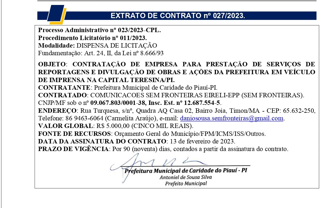 EXTRATO DE CONTRATO n° 027/2023.