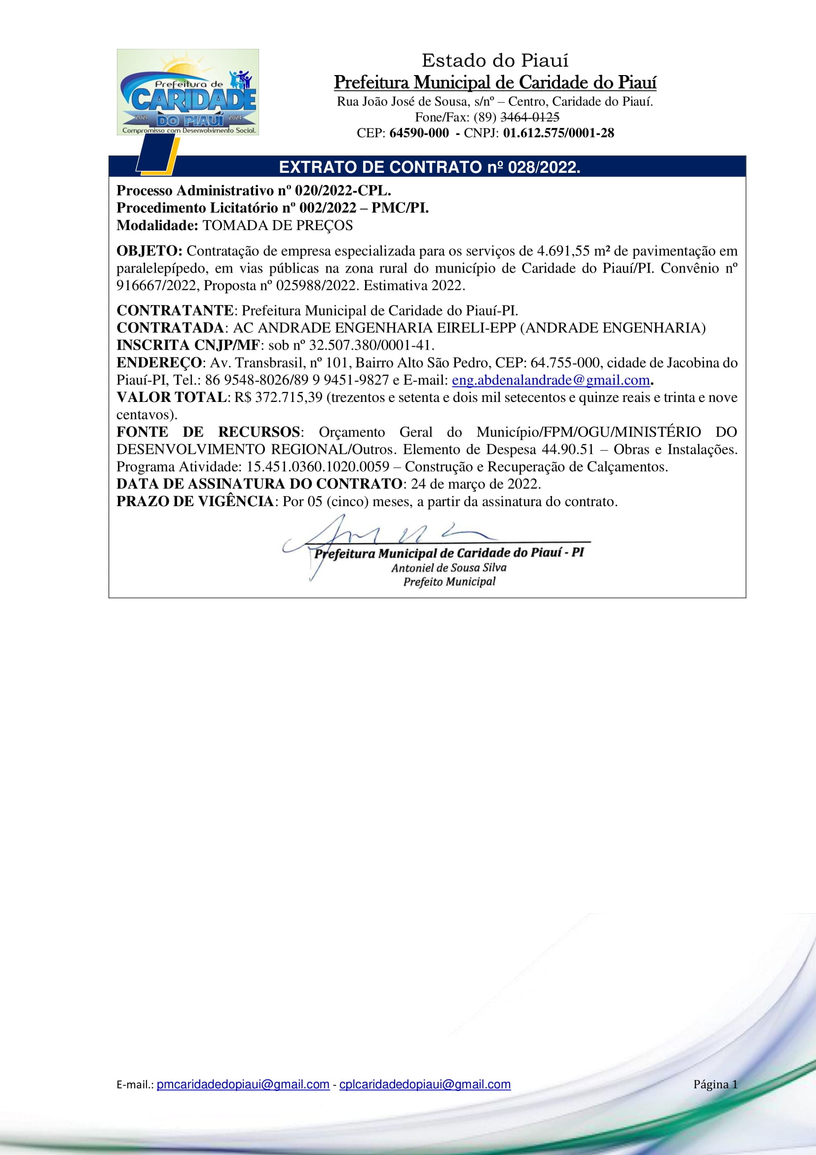 EXTRATO DE CONTRATO n° 028/2022.