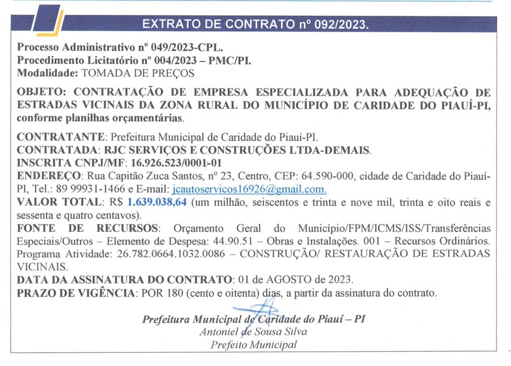EXTRATO DE CONTRATO n° 092/2023.