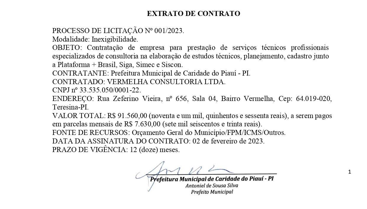 EXTRATO DE CONTRATO PROCESSO DE LICITAÇÃO N° 001/2023.