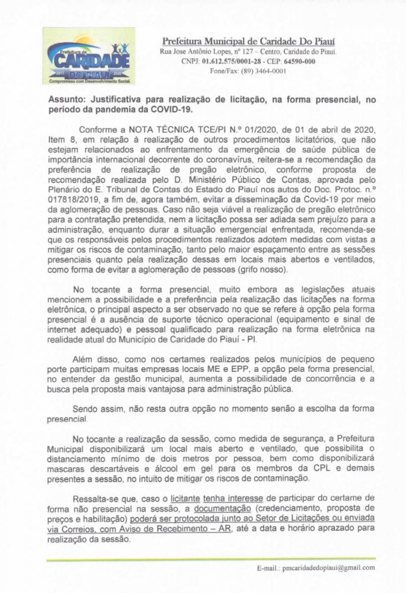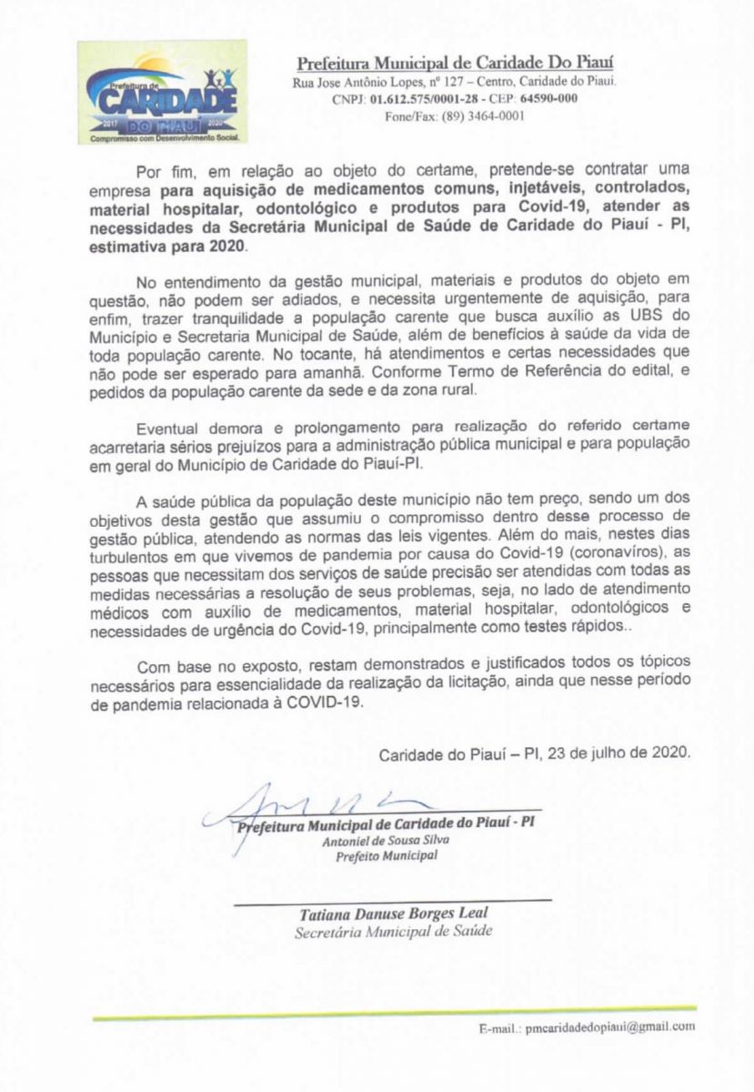 OBJETO DA LICITAÇÃO: LICITAÇÃO PARA A CONTRATAÇÃO DE EMPRESA PARA AQUISIÇÃO DE MEDICAMENTOS COMUNS, INJETÁVEIS, CONTROLADOS E MATERIAL HOSPITALAR E ODONTOLÓGICO E PRODUTOS PARA COVID-19, ATENDER A SECRETARIA MUNICIPAL DE SAÚDE DE CARIDADE DO PIAUÍ/PI.