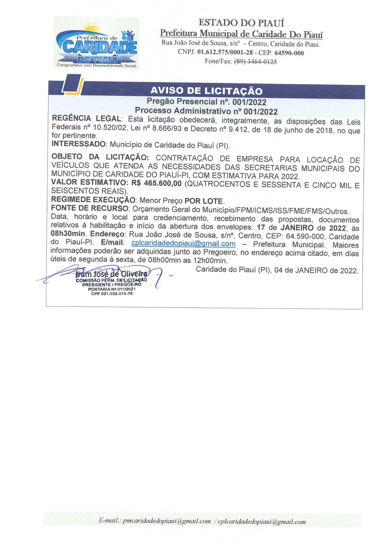 LICITAÇÃO PARA A CONTRATAÇÃO DE EMPRESA PARA LOCAÇÃO DE VEÍCULOS QUE ATENDA AS NECESSIDADES DAS SECRETARIAS MUNICIPAIS DO MUNICÍPIO DE CARIDADE DO PIAUÍ-PI, COM ESTIMATIVA PARA 2022