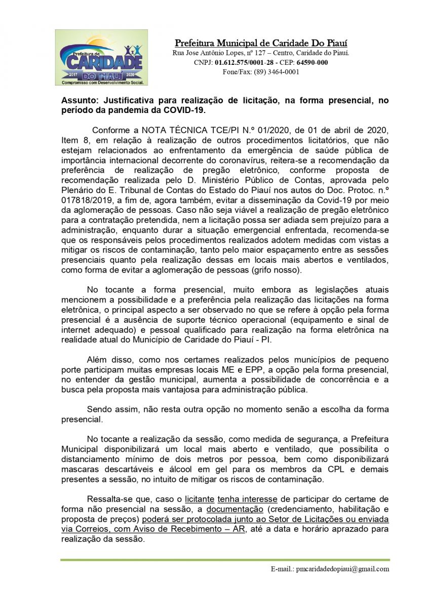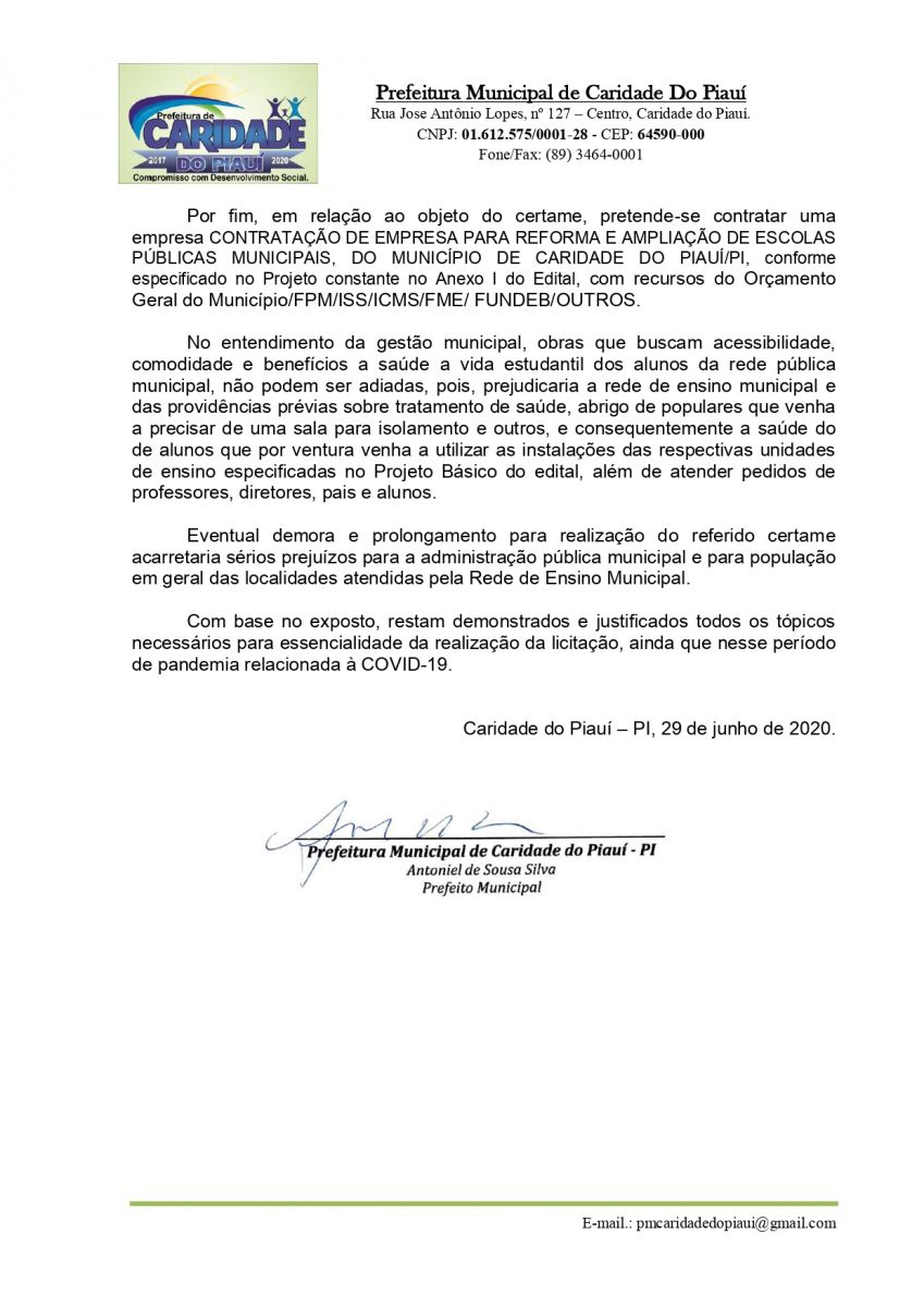 OBJETO DA LICITAÇÃO: LICITAÇÃO PARA A CONTRATAÇÃO DE EMPRESA PARA REFORMA E AMPLIAÇÃO DE ESCOLAS PÚBLICAS, DO MUNICÍPIO DE CARIDADE DO PIAUÍ/PI