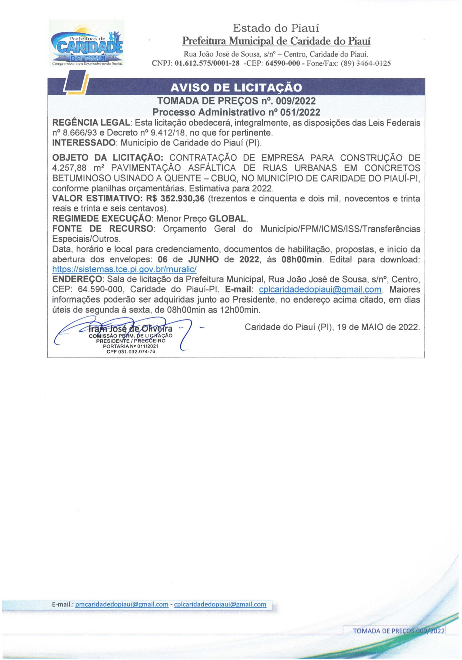 LICITAÇÃO PARA CONTRATAÇÃO DE EMPRESA PARA CONSTRUÇÃO DE 4.257,88 m2PAVIMENTAÇÃO ASFALTICA DE RUAS URBANAS EM CONCRETOS BETUMINOSO USINADO A QUENTE — CBUQ, NO MUNICÍPIO DE CARIDADE DO PIAUÍ-PI,
