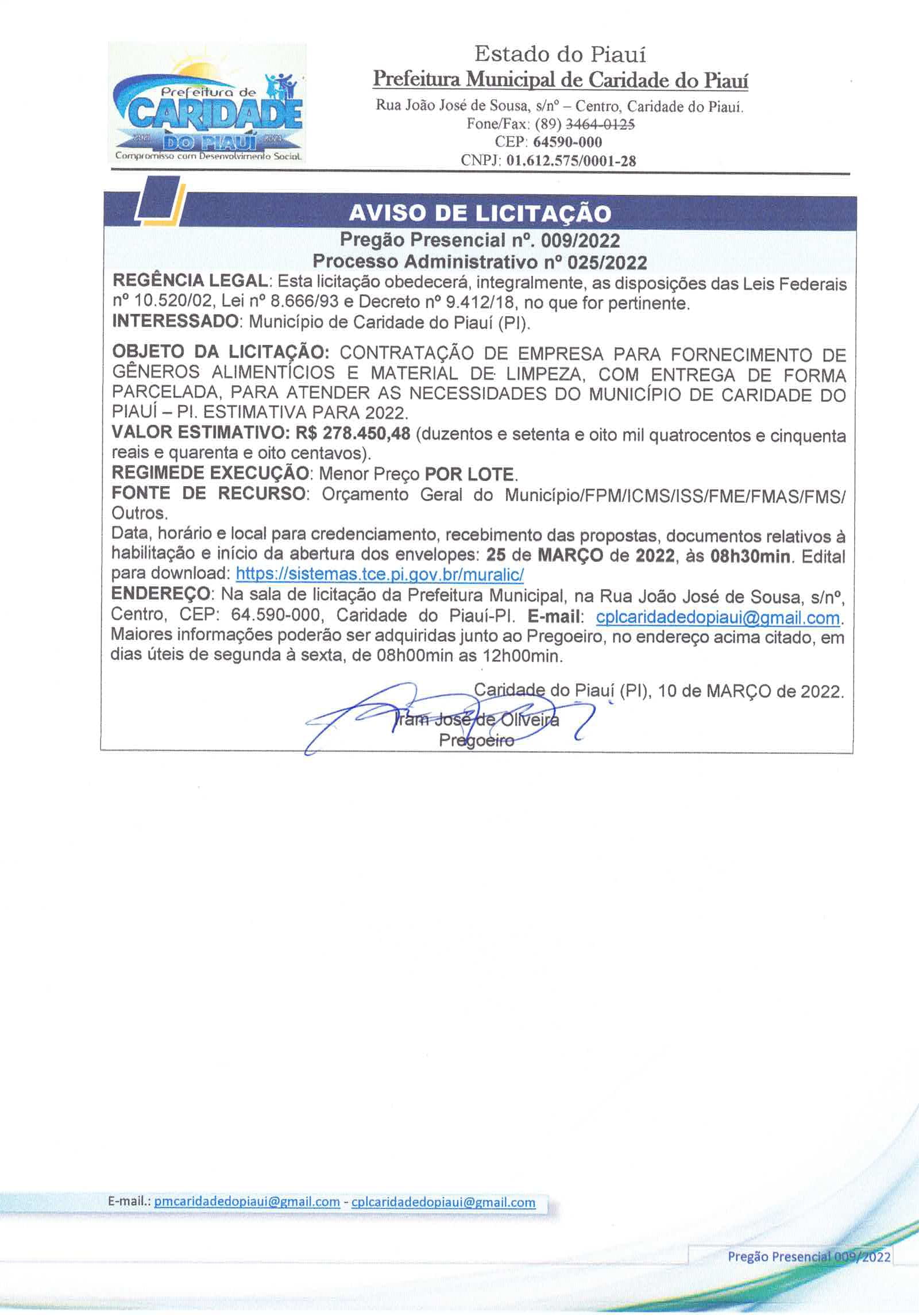 LICITAÇAO PARA CONTRATAÇÃO DE EMPRESA PARA FORNECIMENTO DE GÊNEROS ALIMENTÍCIOS E MATERIAL DE LIMPEZA, COM ENTREGA DE FORMA PARCELADA, PARA ATENDER AS NECESSIDADES DO MUNICÍPIO DE CARIDADE DO PIAUÍ - PI. ESTIMATIVA PARA 2022.