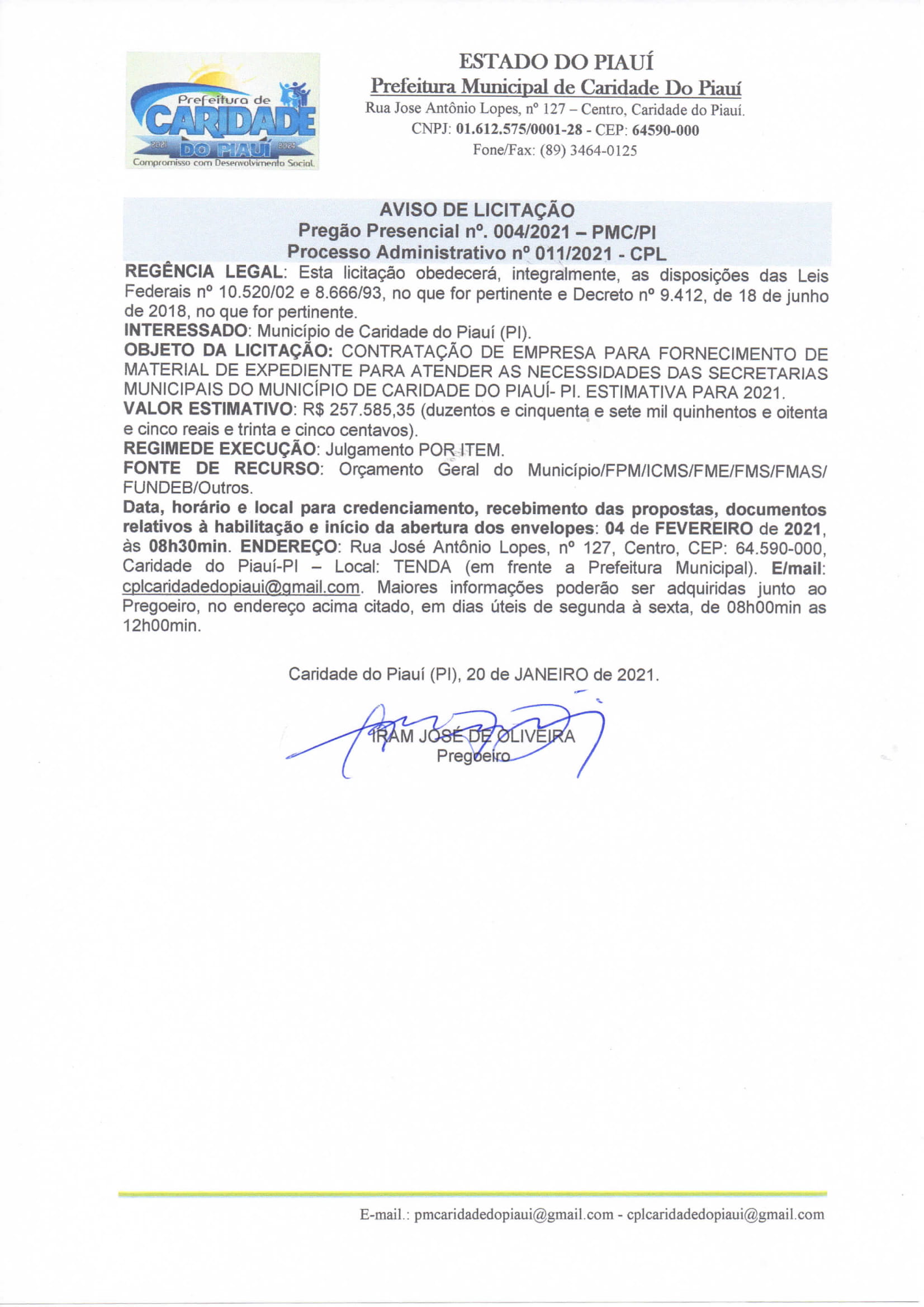 LICITAÇÃO PARA CONTRATAÇÃO DE EMPRESA PARA FORNECIMENTO DE MATERIAL DE EXPEDIENTE PARA ATENDER AS NECESSIDADES DAS SECRETARIAS MUNICIPAIS DO MUNICÍPIO DE CARIDADE DO PIAUÍ- PI. ESTIMATIVA PARA 2021.
