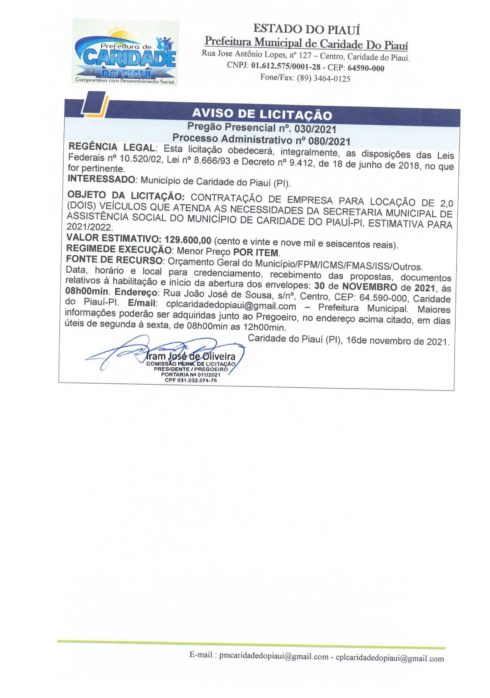 LICITAÇÃO PARA CONTRATAÇÃO DE EMPRESA PARA LOCAÇÃO DE 2,0 (DOIS) VEÍCULOS QUE ATENDA AS NECESSIDADES DA SECRETARIA MUNICIPAL DE ASSISTÊNCIA SOCIAL DO MUNICÍPIO DE CARIDADE DO PIAUÍ-PI, ESTIMATIVA PARA 2021/2022