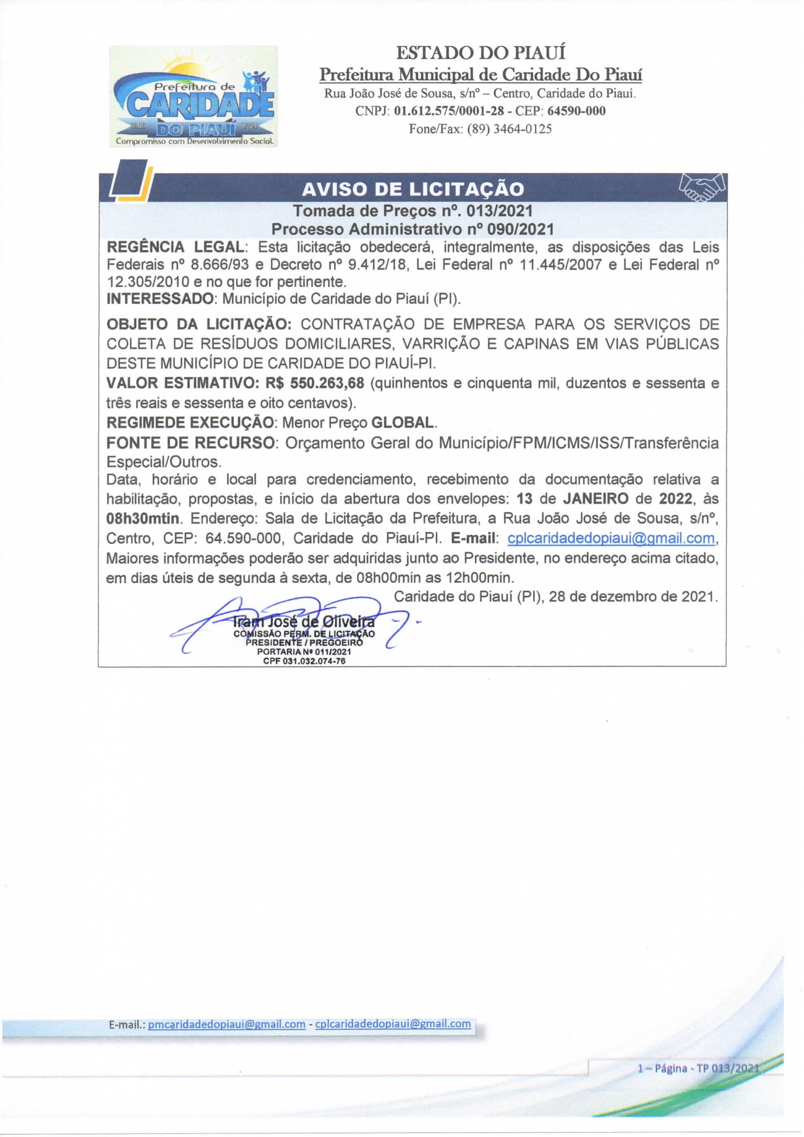 LICITAÇÃO PARA CONTRATAÇÃO DE EMPRESA PARA OS SERVIÇOS DE COLETA DE RESÍDUOS DOMICILIARES, VARRIÇÃO E CAPINAS EM VIAS PÚBLICAS DESTE MUNICÍPIO DE CARIDADE DO PIAUÍ-PI