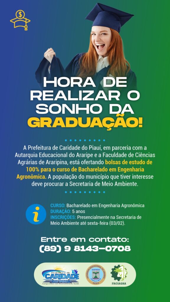 Para oportunizar aos alunos de Caridade do Piauí a ingressar em um curso de ensino superior e assim formar profissionais, a Prefeitura Municipal vai disponibilizar bolsas de estudos gratuitas para o curso de Bacharelado em Engenharia Agronômica.