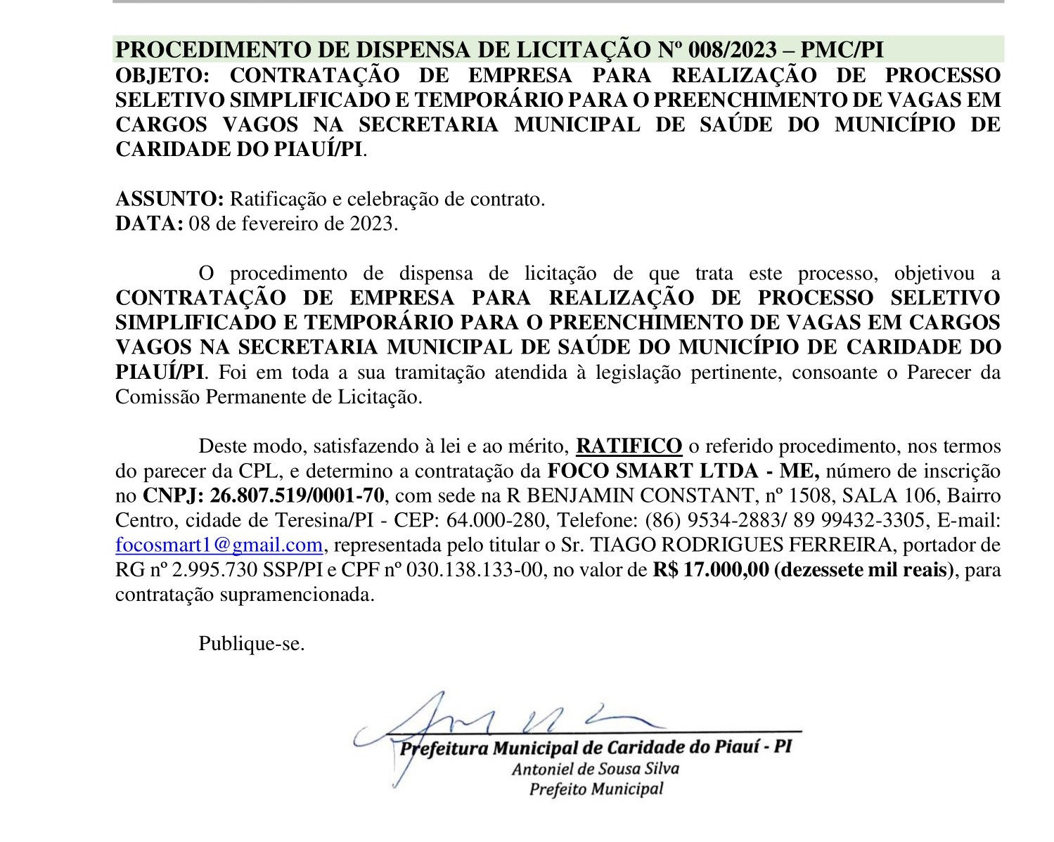 PROCEDIMENTO DE DISPENSA DE LICITAÇÃO N° 008/2023