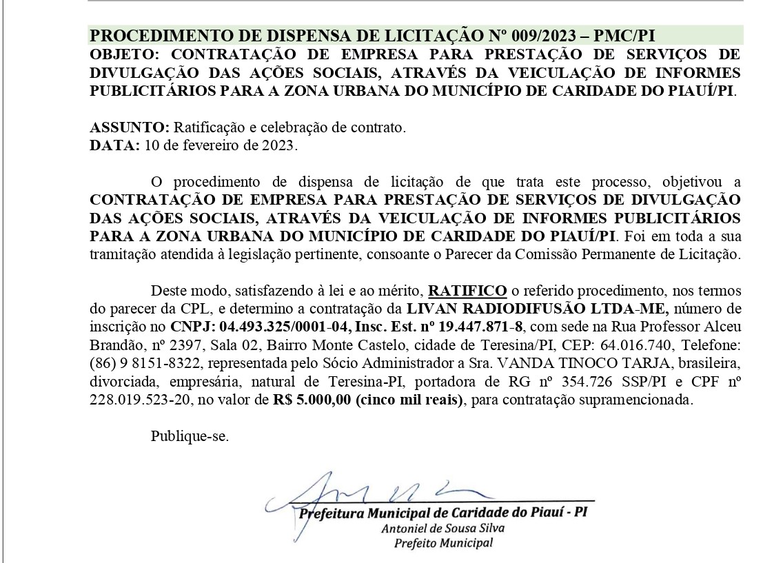 PROCEDIMENTO DE DISPENSA DE LICITAÇÃO N° 009/2023
