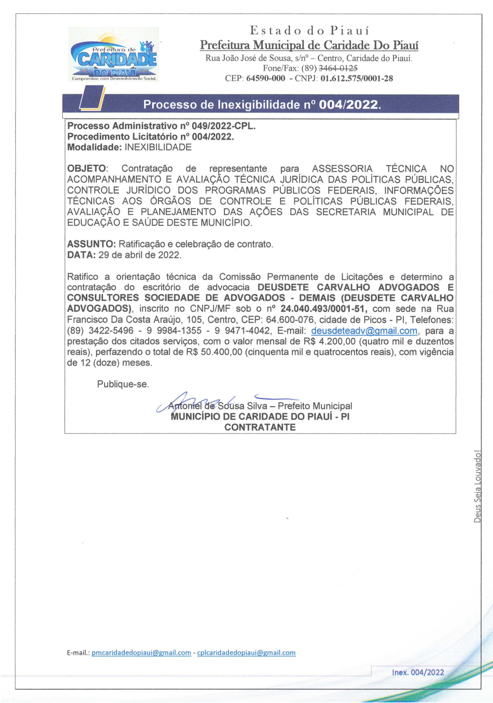 PROCESSO DE INEXIGIBILIDADE N° 004/2022.