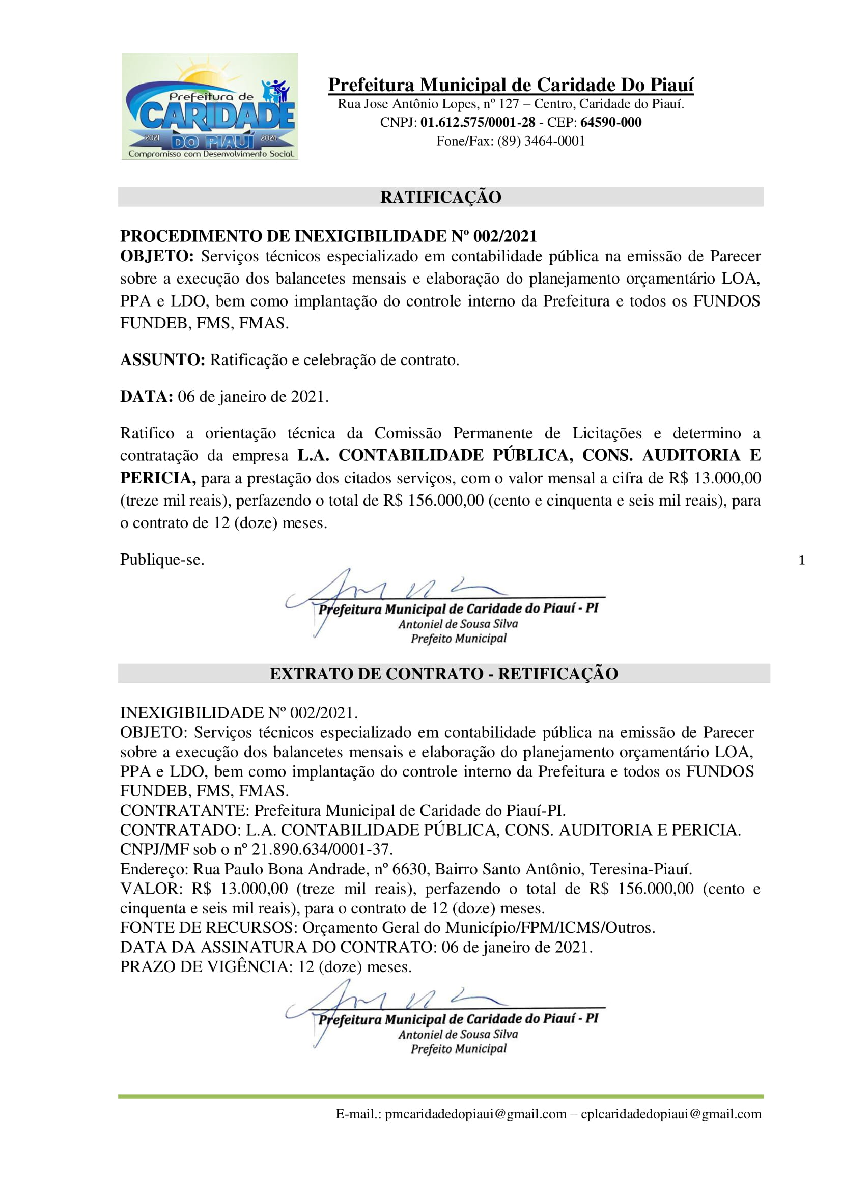 PUBLICAÇÃO DE RATIFICAÇÃO / EXTRATO DE CONTRATO
