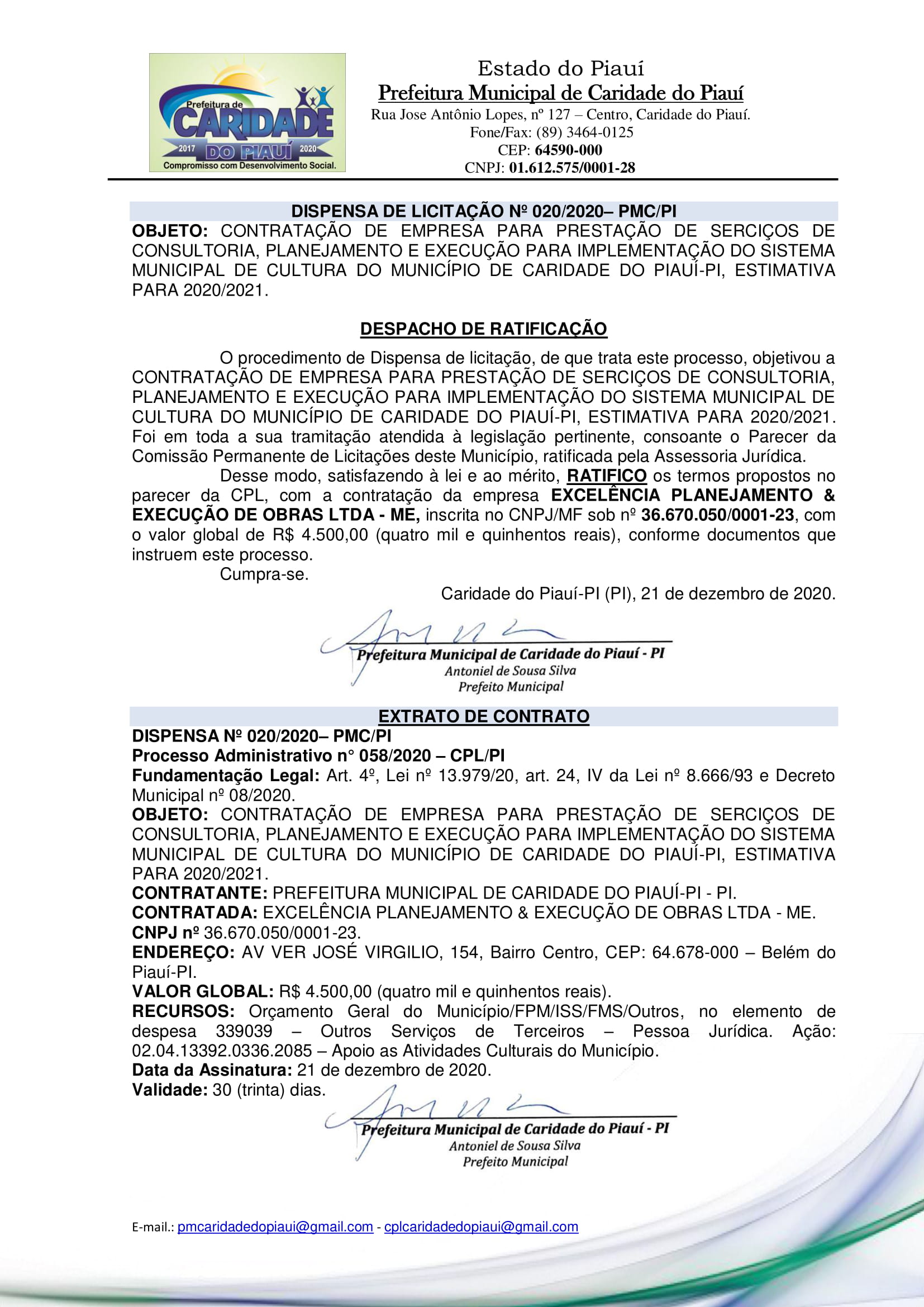 CONTRATAÇÃO DE EMPRESA PARA PRESTAÇÃO DE SERCIÇOS DE CONSULTORIA, PLANEJAMENTO E EXECUÇÃO PARA IMPLEMENTAÇÃO DO SISTEMA MUNICIPAL DE CULTURA DO MUNICÍPIO DE CARIDADE DO PIAUÍ-PI, ESTIMATIVA PARA 2020/2021.